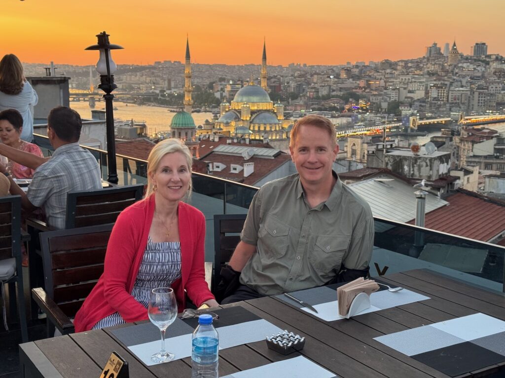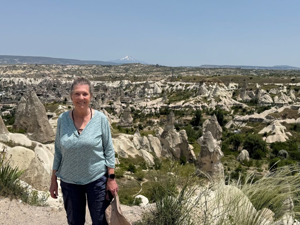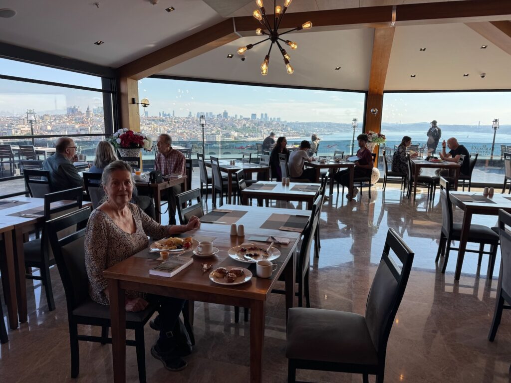 Our flight to Turkey through Frankfurt leaves Friday night at 7:25 P.M. Our son John drives us to SFO. and there is surprisingly little traffic on a Friday afternoon. John drops us off and after quick hugs at the curb, Art and I hurry inside to wait in the United Airline line check in line that usually winds endlessly back and forth but the line is non-existent and we are checked in and through security in a matter of 15 minutes with nearly 3 hours to wait before boarding. We share an uninspired fast food curry meal and then find a bar where we can each enjoy a drink before boarding. Time passes slowly but it does pass and we eventually board our aluminum cylinder. As we board, I gate check my bag realizing that there will not be enough overhead space. We squeeze down the aisle passing spacious private lie down sleeping cubicles and wedge into our back window and center aisle seats that are especially dismal. Art and I are relatively small and usually the financial savings offset the discomfort but I am soon regretting my choice of United Airlines vs Turkish Airlines that had been recommended to us by our travel agent. Drinks take forever to arrive and by the time we are served, there are no options other than a micro-waved chicken dish that is nearly inedible. We each watch a couple of movies. I choose the Bob Dylan one ‘A Complete Unknown.’ Between the roar of the engines and the bad ear plugs, I can barely hear the movie, which is disappointing since much of the point of this movie was the nostalgic soundtrack. For the second time, I disturb our aisle seat mate to use the bathroom and take a Zolpidem tablet and manage several hours of sleep before being awakened to a dismal breakfast sandwich.