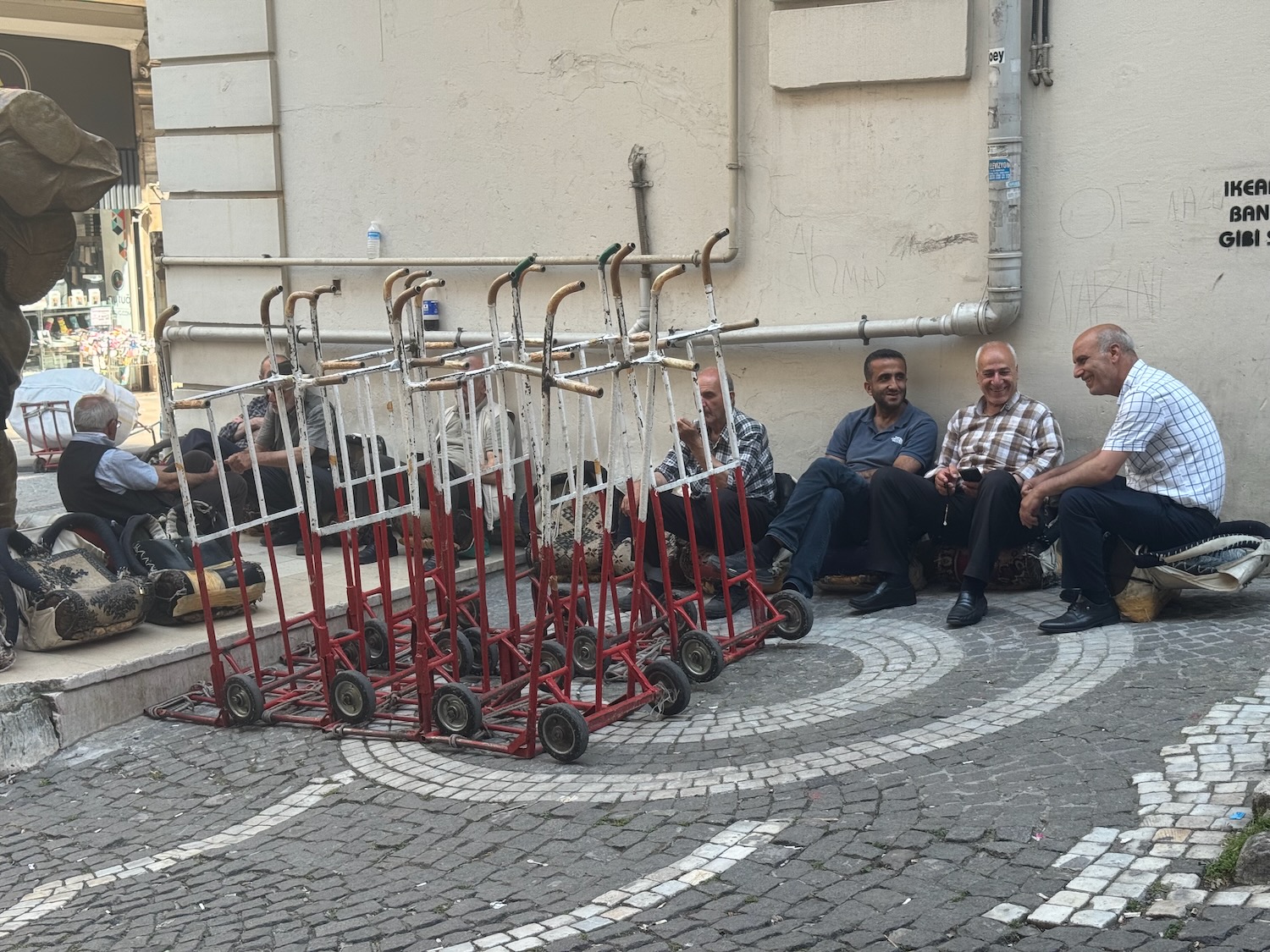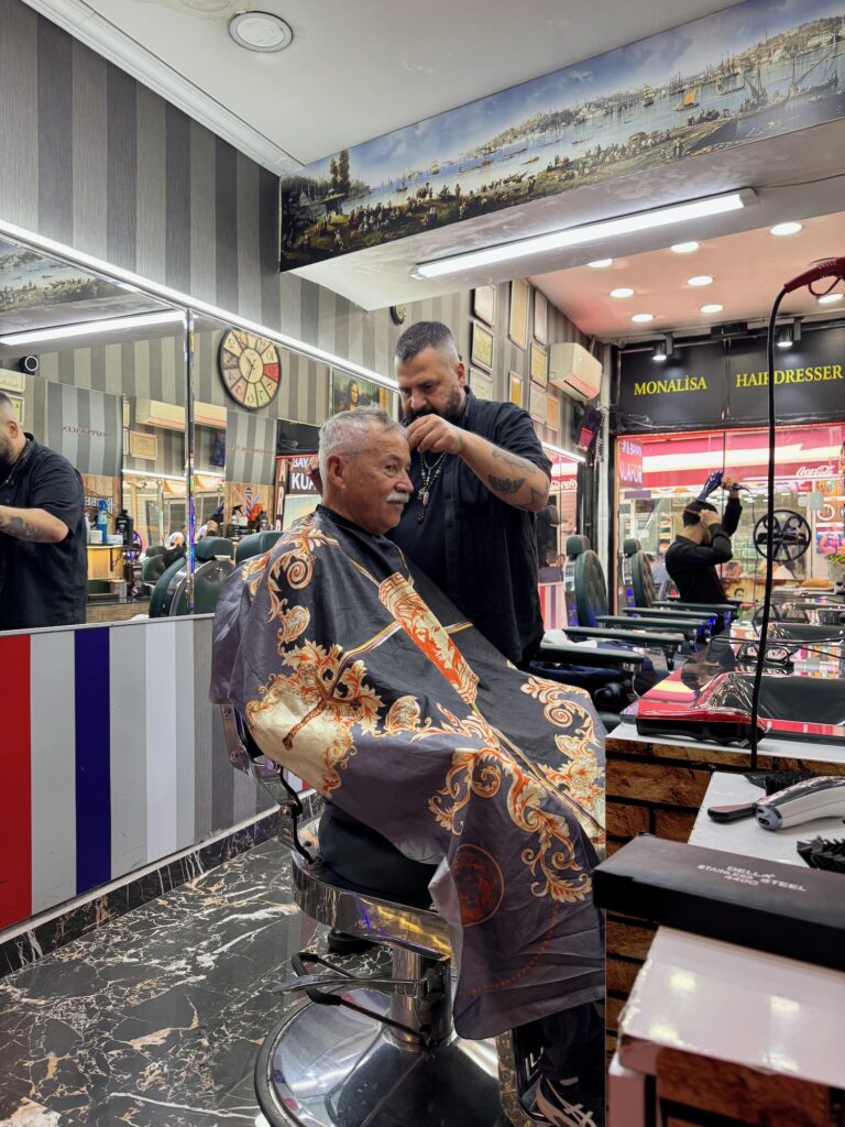 After breakfast we walk down the very steep cobblestone street towards the sea. Our hotel is in a wholesale garment district for children’s clothing and tiny suits and frothy little girl dresses hang in the many shop windows. It’s a busy morning in this area and men haul sacks of clothing upon their bent backs straining up the steep street delivering inventory to the many stores in this district. Men take their tea and smoke breaks clustered together around tiny tables or sitting in doorways and upon parcels needing to be delivered. The air is alive with the promise of a profitable day ahead for these shop keepers. We descend several flights of outdoor steps and the street levels off. We cross intersections with care as drivers do their morning commute. We are in the heart of the old town and retail shops and cafes line the narrow streets. Art has been wanting a haircut and he inquires the price from a hefty, tattooed barber. It is 300 Lire or about $8.00 and I hear that the price is for a hair cut only. I sit in the back and happily watch as the barber performs his magic. The hair cut looks good and the barber asks if Art would like his ear hairs trimmed? Art nods but does not ask if the ear trim will be extra. Within seconds, the barber has two rolled newspaper cones stuck into Art’a ears and lights them on fire. Two torches burn from Art’a ears and I am amused and delighted. The barber is cleaning out ear wax along with any stray hairs. When the flares burn out he unrolls the cones and points to some waxes residue on the paper. Art thanks him and rises to pay but the price has changed from 300 lire to 1100 lire. I feel the entertainment was priceless but Art grumbles for the next few minutes feeling swindled. We meander down towards the water and find ourselves on a covered market street. Tiny shops are selling a mish-mash of tourist trinkets, household goods, foods and spices. Blue glass evil eye trinkets are everywhere. An arcade connects the market street and within the arcade are jewelry shops, antique shops, clothing shops and shops selling designer knock offs. This arcade opens onto a square and after a few minutes of indecision, we sit at a small table in the shade of an open square and order hot Turkish tea. There are no surprises here.