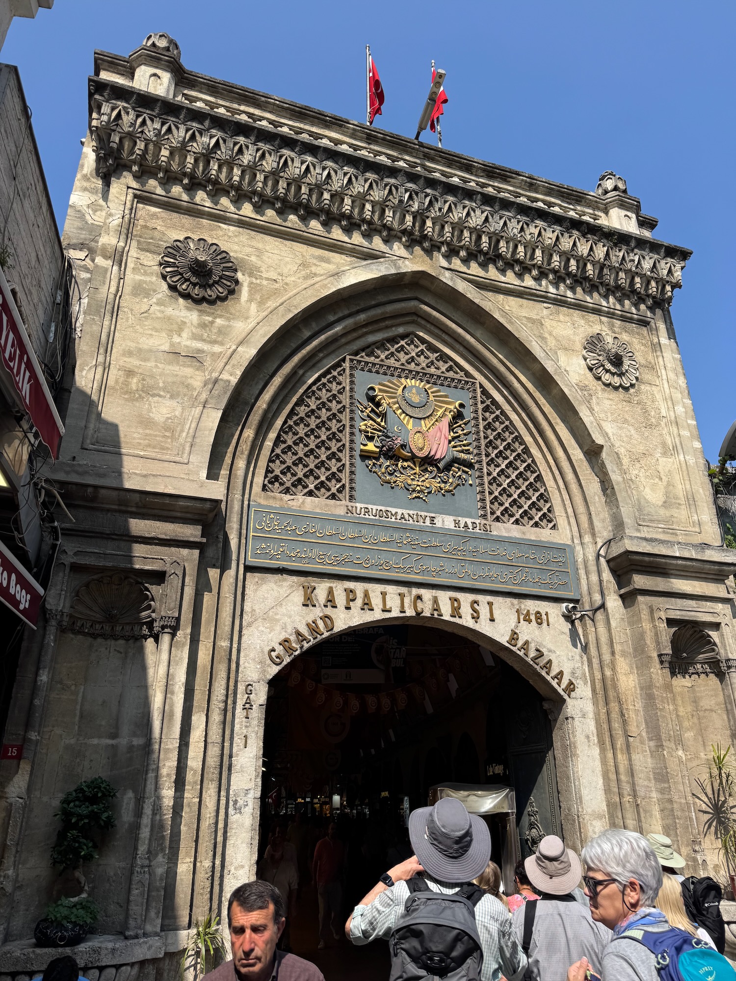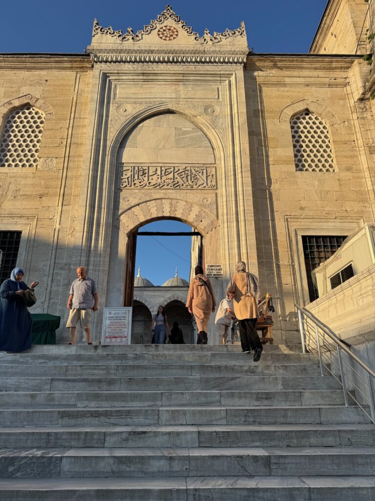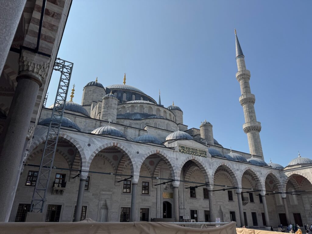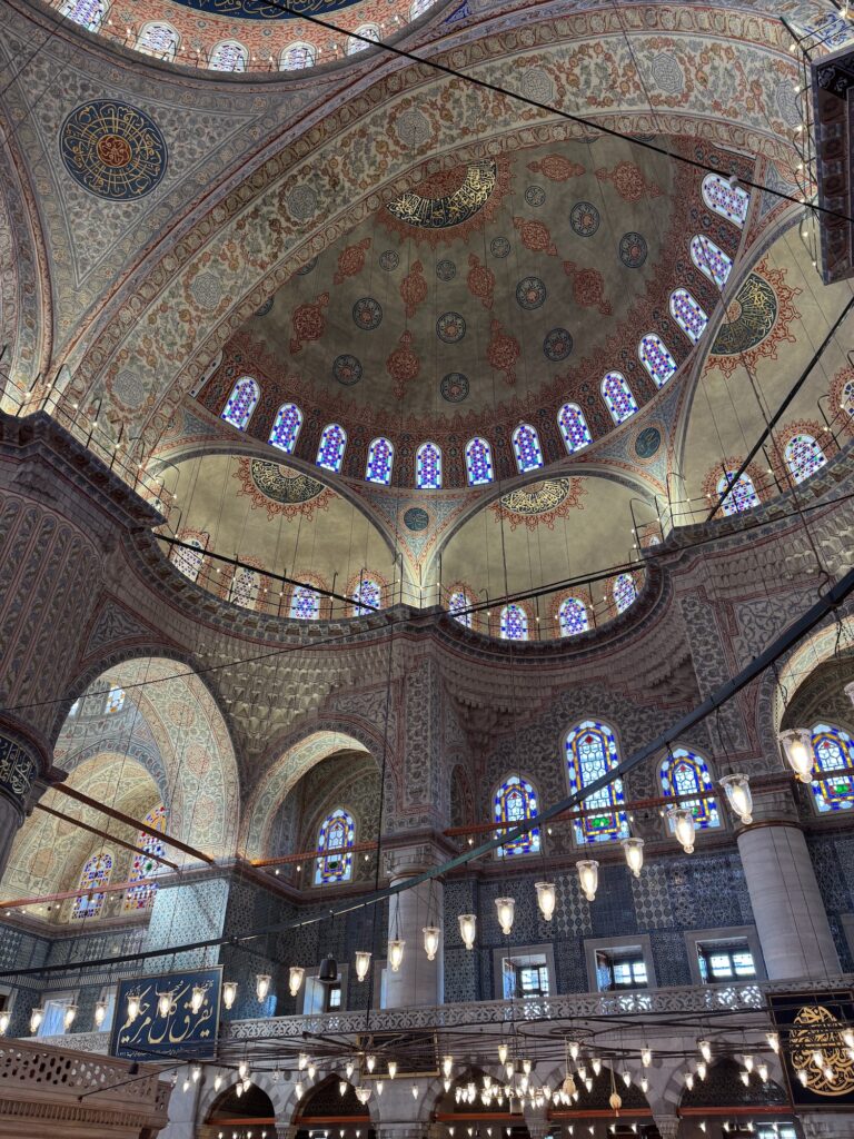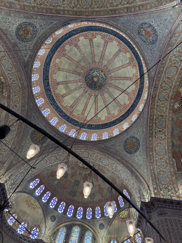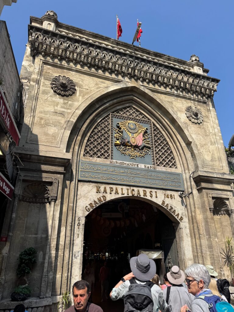 There is reason for the Blue Mosque’s name. The walls are covered with blue tiles and the dome and arches painted with geometric patterns. Similarly to Hagia Sophia, the dome floats on a ring of windows and light streams down through many multi colored blue stained glass windows. A complex curlicue iron structure supports an odd mixture of chandelier lights. Visitors circulate around the perimeter and the center terracotta colored wall to wall carpet is for worshipers. Although monumental and beautiful, I don’t feel the awe or the magic that I felt yesterday at Hagia Sophia. We exit into a center courtyard, and have time on our own to enjoy the sunlight before rejoining our tour for our walk to the Grande Bazar.