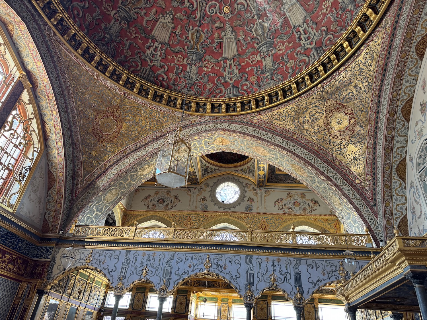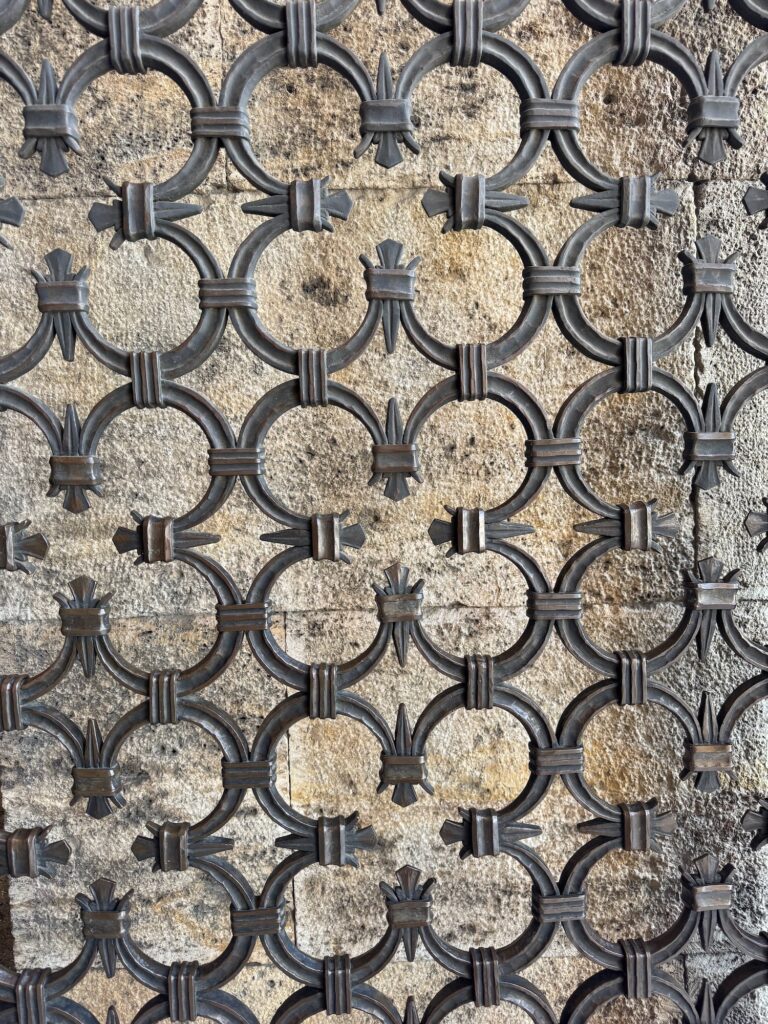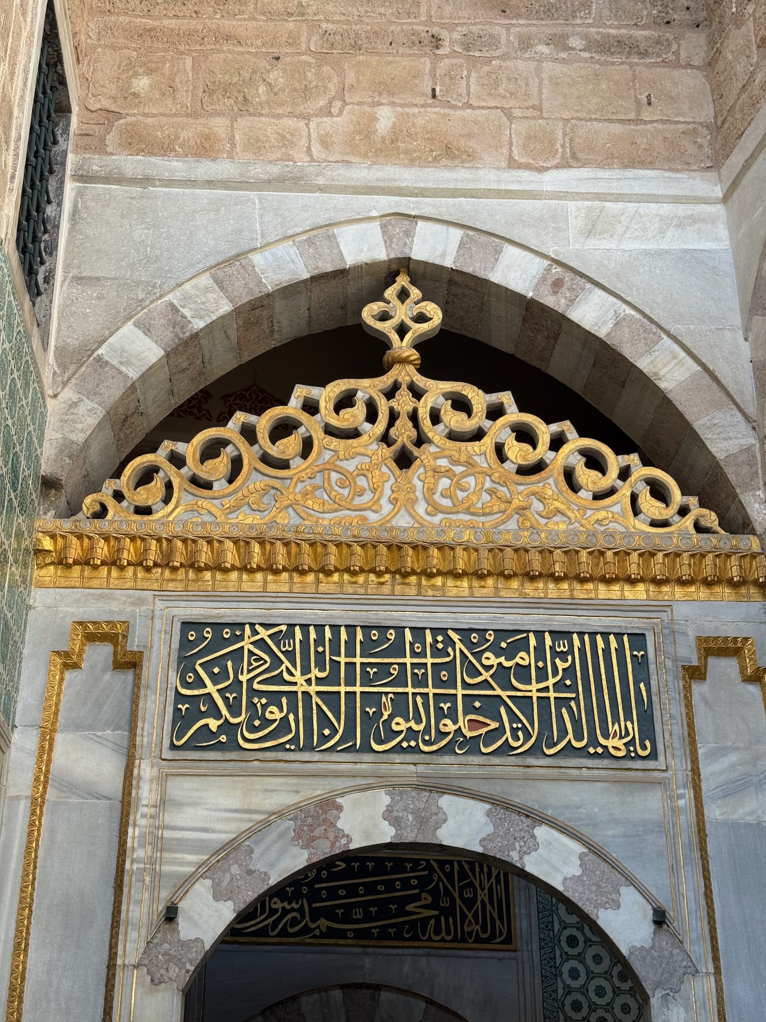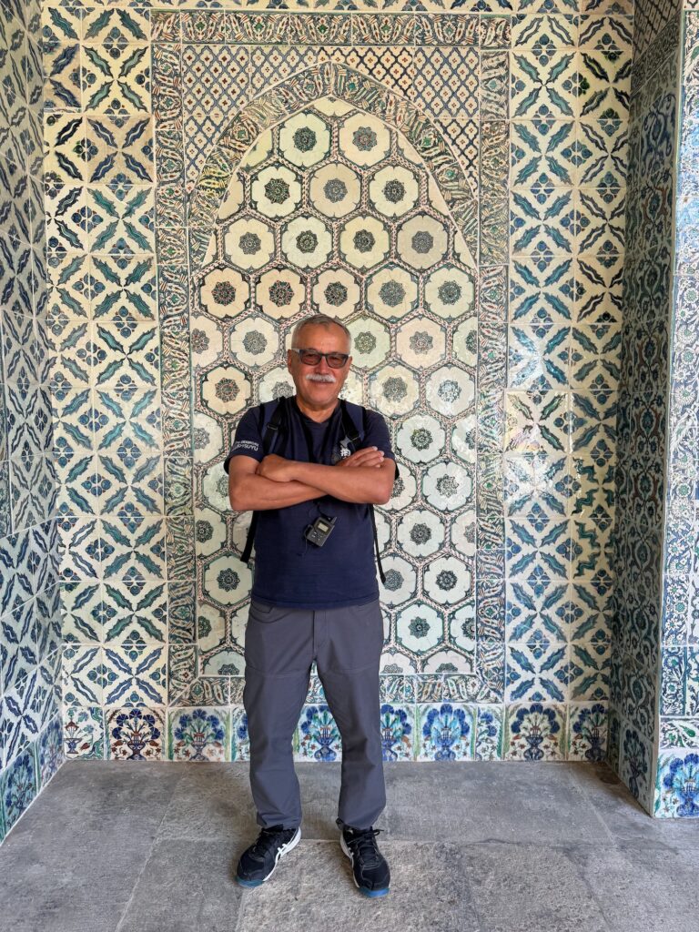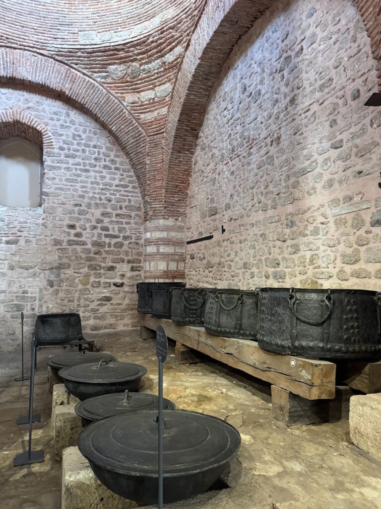 We begin our tour along the long corridors of the vast kitchens and storage rooms. The thick stone walls and high ceilings keep food cool. Between the hierarchy, guards, cooks and the royal residence, 3000 people needed to be fed daily. The logistics and complexity to keep the Palace supplied and to feed and house so many is remarkable. A few of the kitchen spaces display ancient metal cauldrons and skillets. There are dedicated rooms just to make sweets for the palace. We leave the utilitarian kitchen blocks and tour the gardens and royal residences. Scalloped archways frame ornate tiled rooms. Every surface is intricately embellished with geometric patterns and Islamic script. Some panels are gilded bronze or gold, seemingly cast but when I examine them more closely they are metallic painted and high fire tiles.