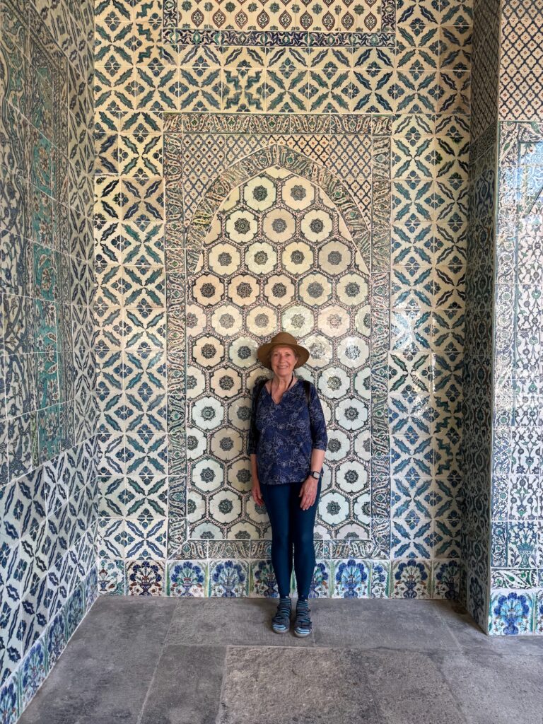 We walk quickly across a plaza with an Egyptian obelisk and onto cobblestone streets that begin to narrow. An ancient archway reads “Grande Bazar” and as I enter, I feel overwhelmed with the visual intensity of it all. I might as well be at the Tucson Gem and Mineral show. Each touristy glass window is packed full of antique jewelry or gold jewelry and the labyrinth of stalls in the covered market place sell everything from designer knock offs to leather goods and silk scarves. I have traveled to 60 countries and experienced similar markets in each. Although the streets are picturesque and ancient, I feel like I am in just another tourist trap. Taylan pauses at a cashmere shawl shop to allow our group time shop and as a meeting point after an hour of free time to explore the market. My back hurts and without asking, Art performs a sleight of hand and sets my telescoping stool against a center pillar. I sit and lean back in relief and watch others in our tour swarm the cashmere shawl shop. I have left my Adville back at the hotel and Art sets off on a mission to find a pharmacy in the maze of shops. (I think Art is grateful for a mission.) A man from the cashmere shawl shop appears quickly with an hour glass cup of tea set precariously on a saucer and I and accept it. I surmise that I am entitled to this courtesy as part of the Rick Steve’s tour and watch a few of our tour group choose and pay for their overpriced scarves.