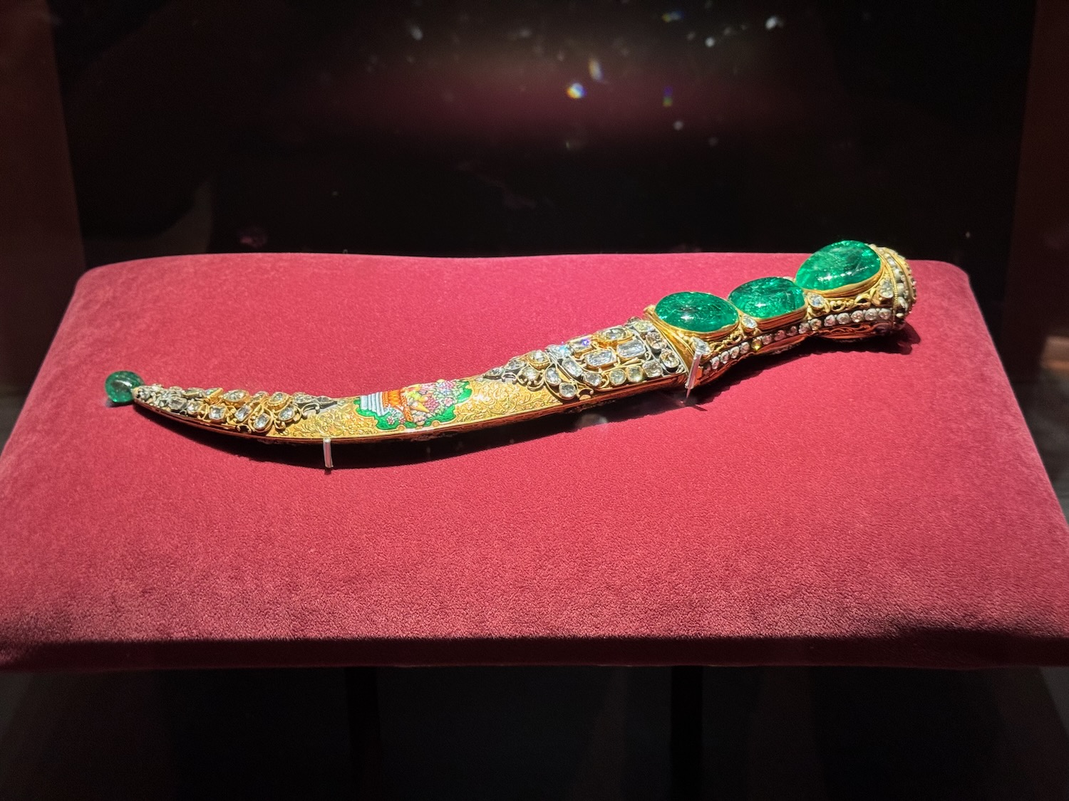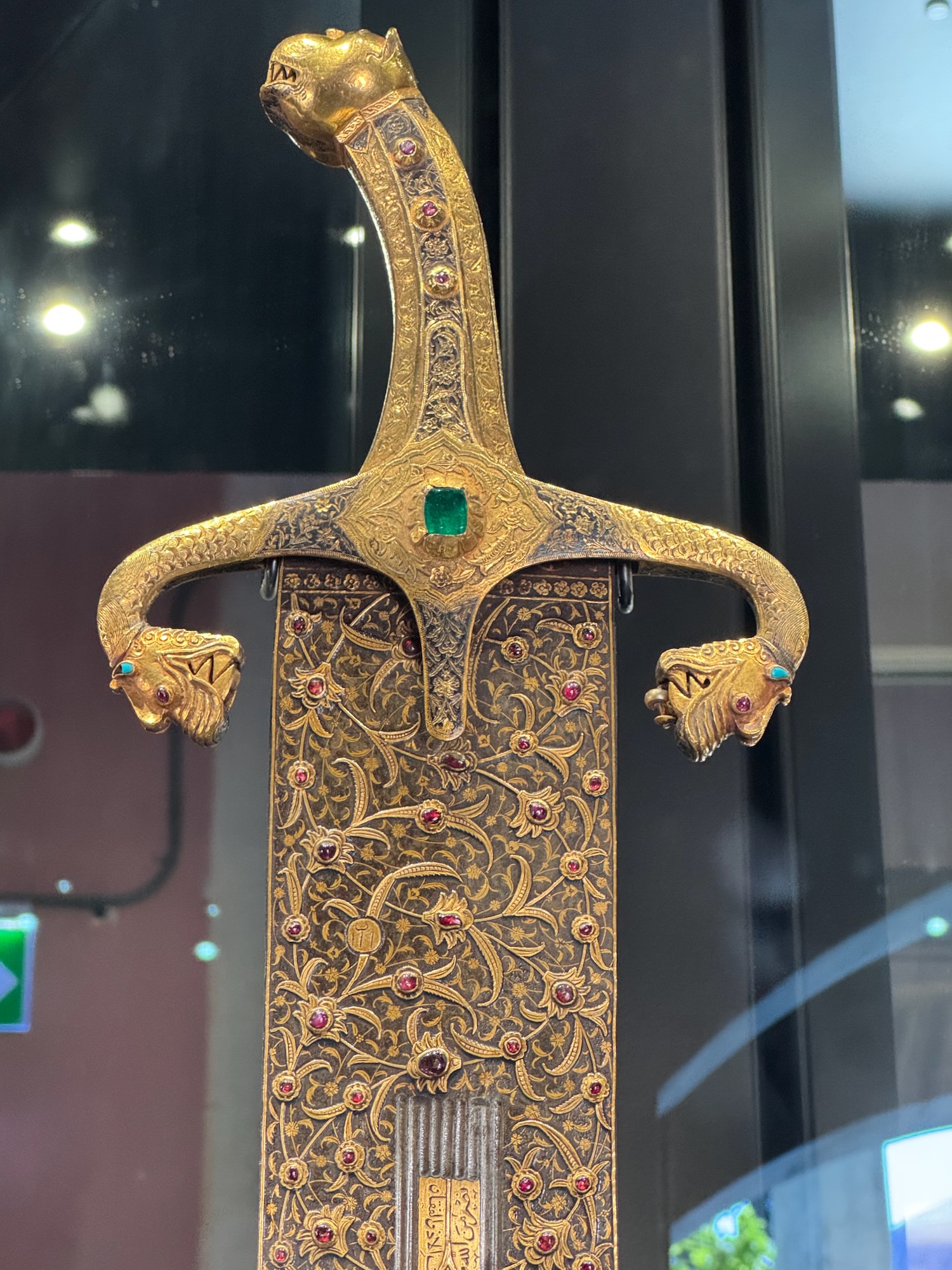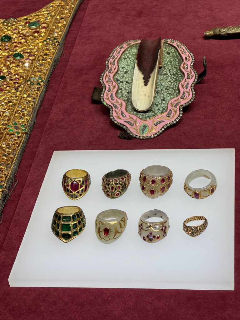 Jewel embedded gold rings. A jewel encrusted sword with dragon head handle. The famous Topkaki Dagger. Encrusted with diamonds and emeralds.