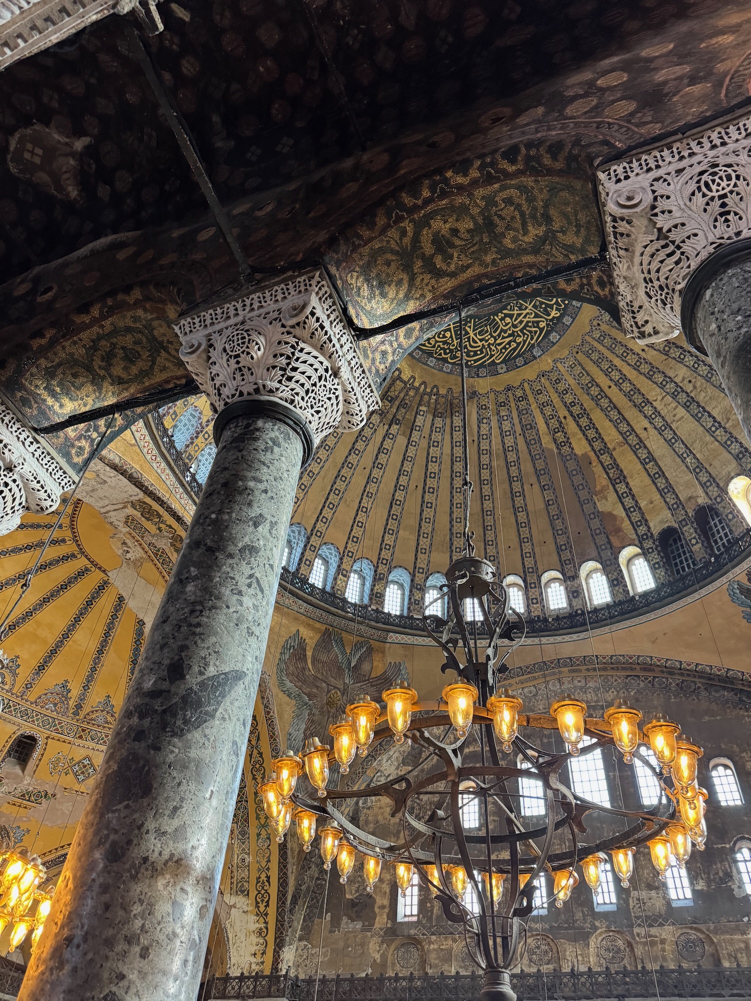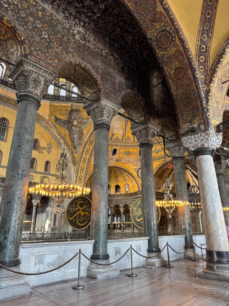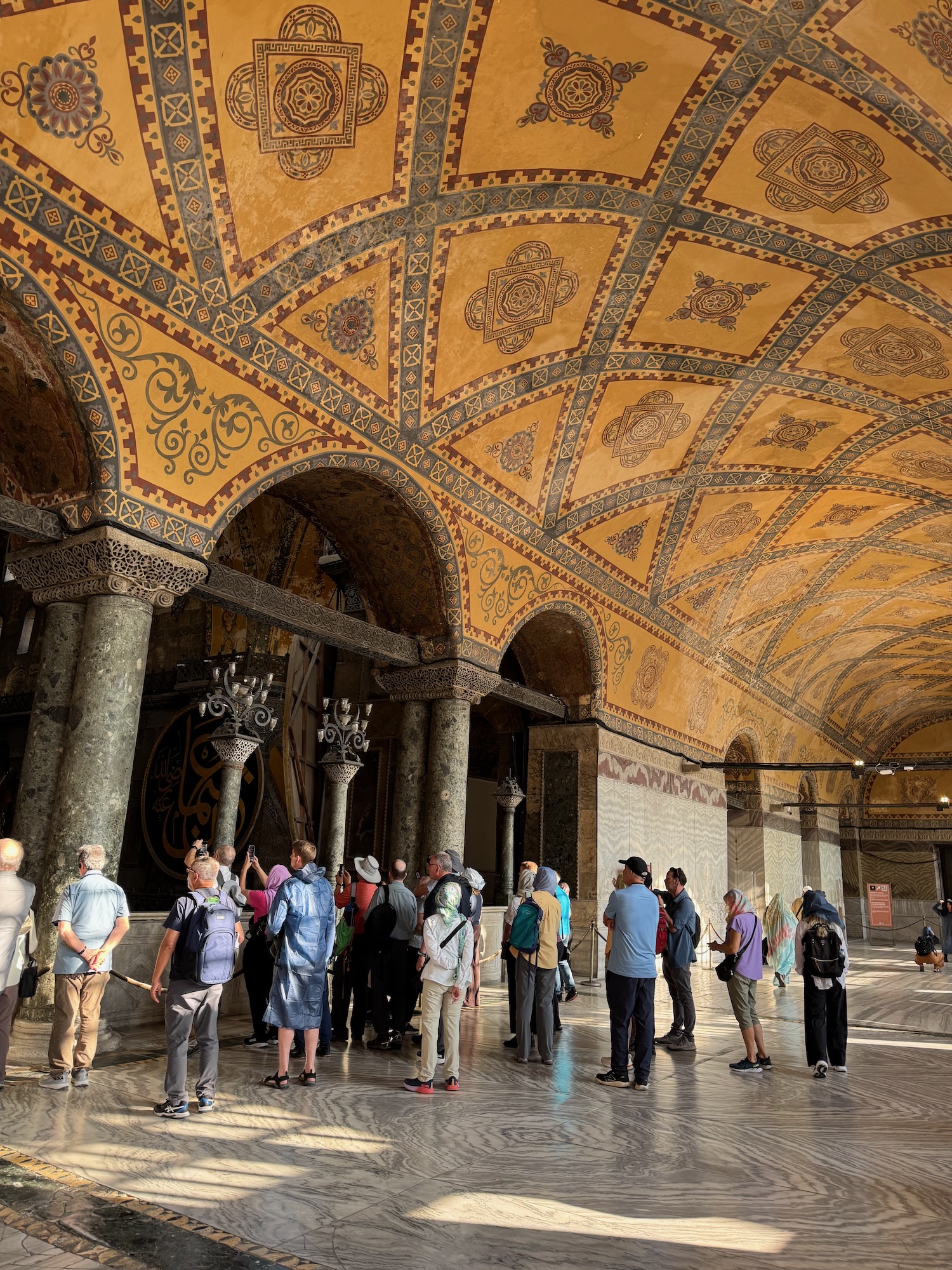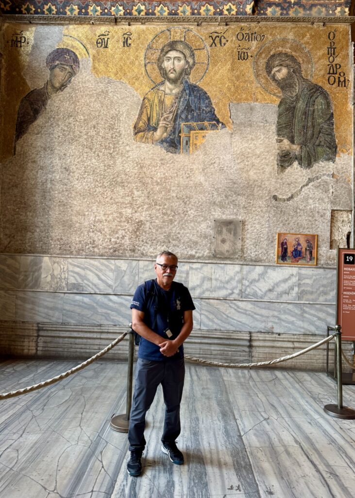 Hagia Sophia was build in 530 A.D. as an Orthodox Christian Church. When the Ottomans conquered Constantinople in 1453, Hagia Sophia was transformed into a Muslim mosque. It was later transformed into a secular museum and only recently it was converted back to a mosque. The Byzantine interior is magnificent. Many surfaces are encrusted with tiny mosaic tiles and geometric frescos cover the ceilings and walls. The central dome floats on a ring of windows that illuminates the vast interior. Chandeliers alit with rings of golden light bulbs hang symmetrically between the massive marble columns that support the dome. Art is especially struck by the historical significance and beauty of this iconic place of worship. The Deesis Mosiac of Jesus, John the Baptist and Mary is seriously damaged but Art glows as I take photos of him standing in this notable place of history.