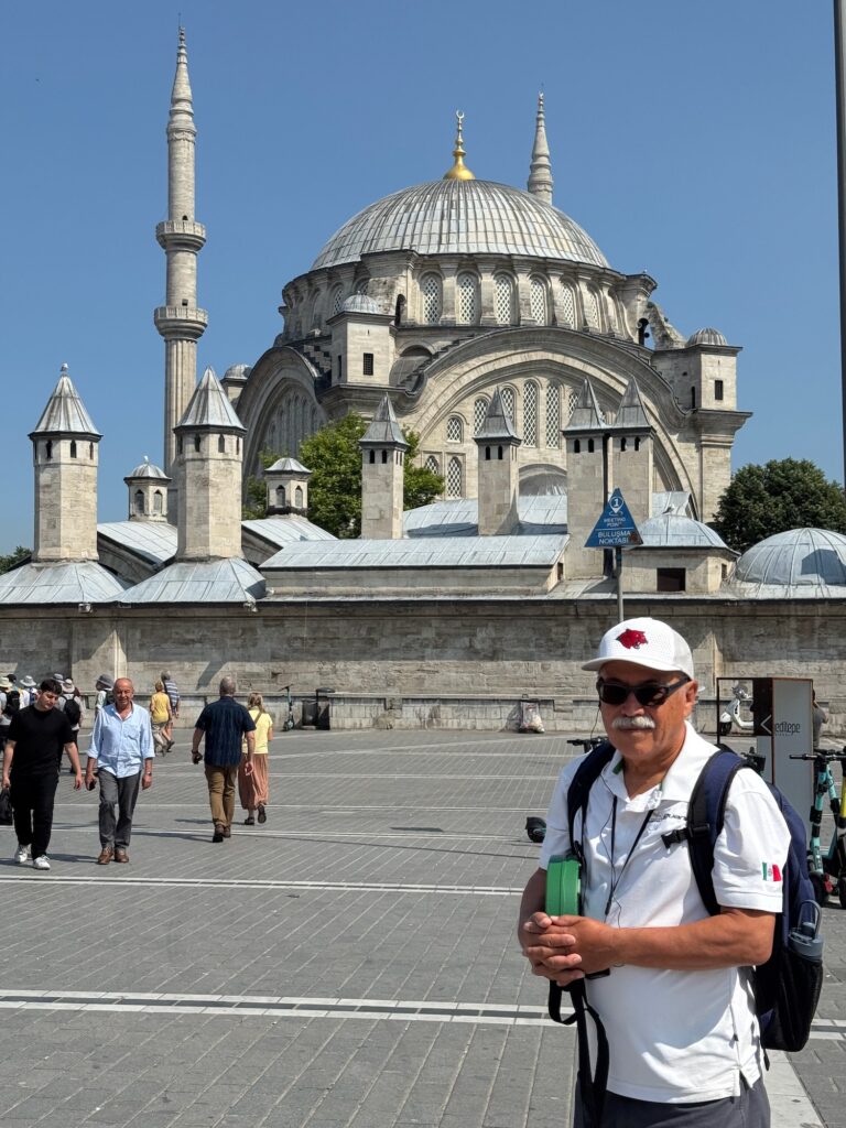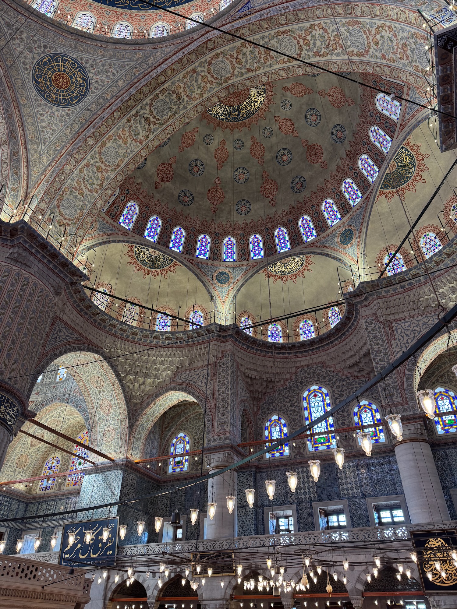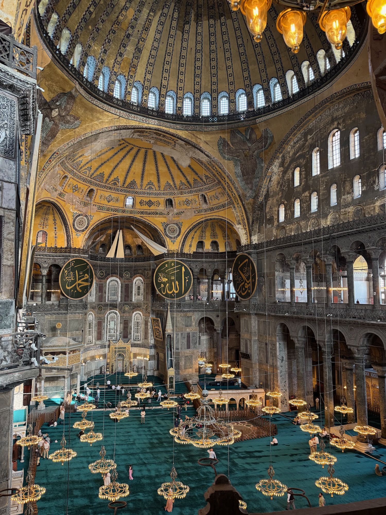 Hagia Sophia was build in 530 A.D. as an Orthodox Christian Church. When the Ottomans conquered Constantinople in 1453, Hagia Sophia was transformed into a Muslim mosque. It was later transformed into a secular museum and only recently it was converted back to a mosque. The Byzantine interior is magnificent. Many surfaces are encrusted with tiny mosaic tiles and geometric frescos cover the ceilings and walls. The central dome floats on a ring of windows that illuminates the vast interior. Chandeliers alit with rings of golden light bulbs hang symmetrically between the massive marble columns that support the dome. Art is especially struck by the historical significance and beauty of this iconic place of worship. The Deesis Mosiac of Jesus, John the Baptist and Mary is seriously damaged but Art glows as I take photos of him standing in this notable place of history.