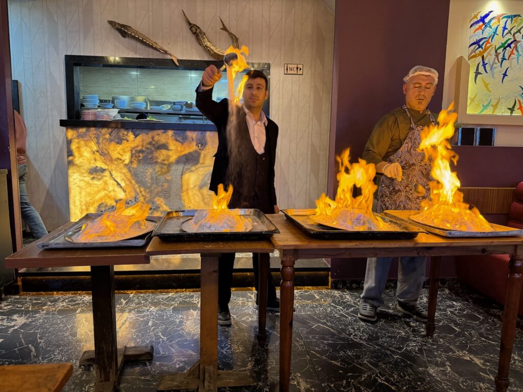 We follow our guide like obedient ducklings and with our unobtrusive single ear piece phones we walk down to the harbor for dinner. We only joined our tour 5 hours ago but it already feels (in a good way) that we have been on this tour for days and made friends. I am dubious about having dinner at any touristy waterfront restaurant but we are ushered into one of many and our group of 28 is seated at two long tables. I am ‘inland’ and on the far end but I still have a lovely view of the harbor. As an introvert this end position is ideal and means that I will have fewer people that I am obligated to talk with. Aside from Art there are 3 other men at our end and I relax into their conversations of navigation and history and am grateful that I don’t have to engage in the girl talk a few seats away. Art soon suggests that I change places so he can be more engaged with the men’s conversation of aviation and history and I am agreeable after my first glass of wine arrives. I join the women’s conversation and smile a lot but I am totally uninterested in whatever they are talking about and simply watch the harbor view and anticipate the arrival of our salted fish. We are served Turkish pita bread and uninspired meze dips of eggplant and hummus.