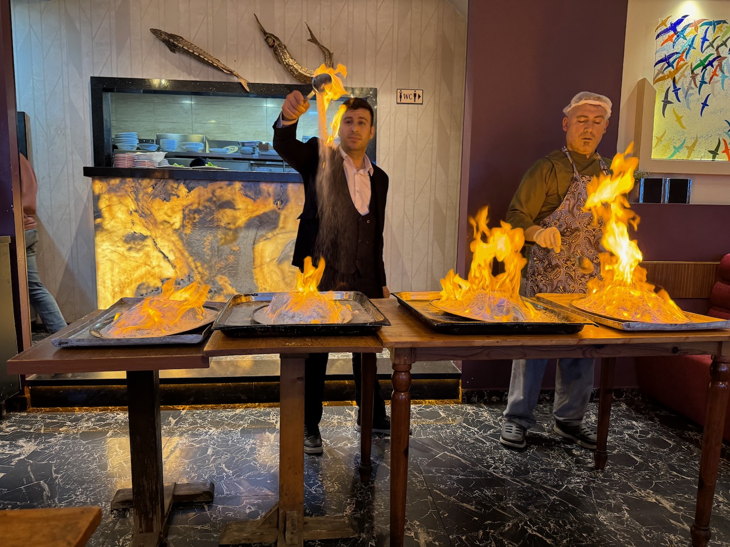 Istanbul waterfront and the Blue Mosque Salted fist on fire at a waterfront restaurant. The Blue Mosque at night