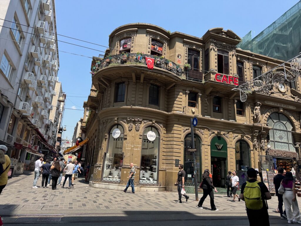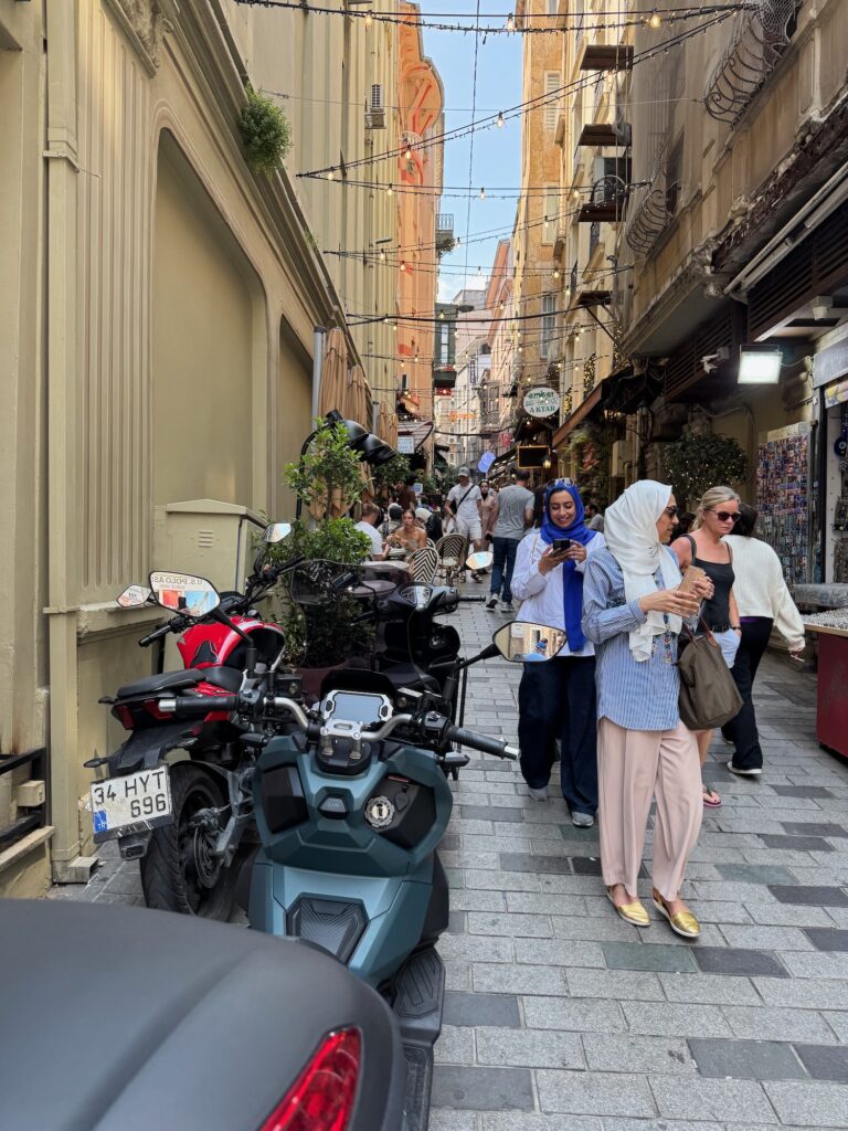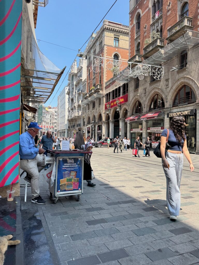 Our group takes the subway from the old city across to the new city and we pop up and out in a different universe. We walk as a group along Istiklal Street and Taylan points out the best ice cream shops, art galleries and eateries. After a few blocks we are set free for two hours to find lunch and shop. Naturally, the majority of our group follows Taylan to his suggested restaurant and it is good. It isn’t especially touristy or expensive. We sit with our new friends; Yu-lin and Paul and we individually point at a hot buffet to choose the dishes we want to order. I’m already finding the meat dishes tedious so I choose a vegetarian option; an artichoke heart and an eggplant dish, both of which are excellent.