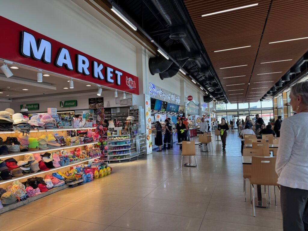 Taylan cautions that any claustrophobics might want to forgo this visit explaining that there is a long section where one must hunch and once past a certain point, you must commit to the entire visit. It’s extremely interesting and I am not claustrophobic but my legs are wobbly from days of over exertion and I go only as far into the complex as the point of no return. Taylan leads several of us back to the blinding light of day and I wander the usual tourist gift shops outside the cave entrance. I am not much of a souvenir shopper but wanting to sit at a shady table, I choose an ice cream bar, the price of a seat and sit happily and wait for our tour to return.