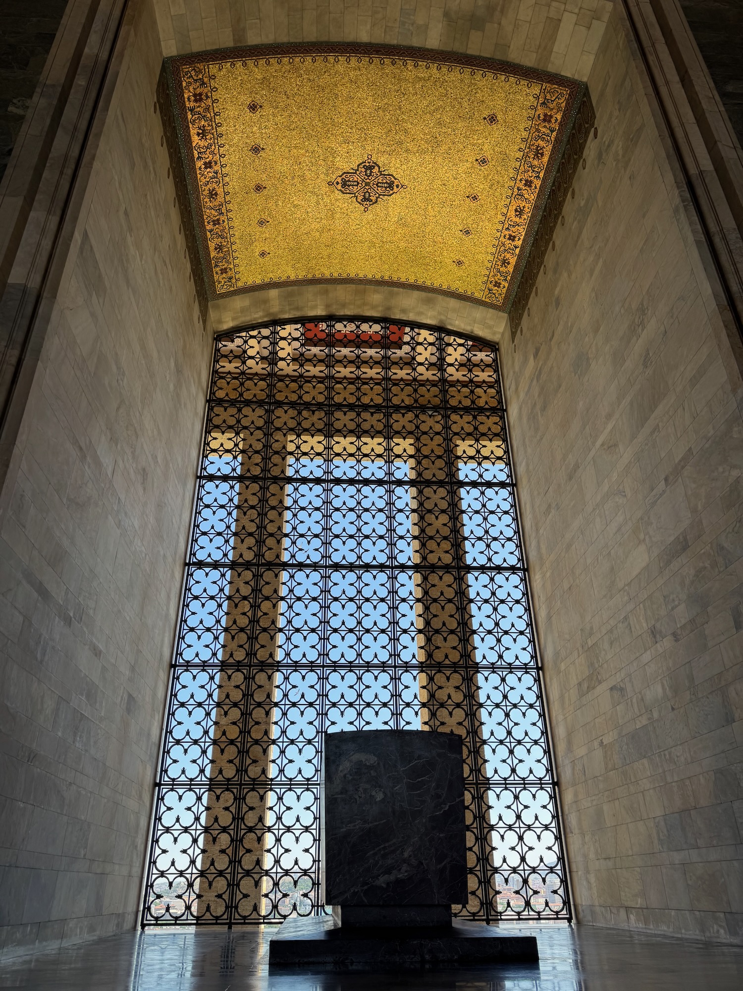 Mustafa Ataturk was the founder of modern Turkey. He was the president of Turkey from 1923 – 1938. It’s quite a walk from the bus up hill to the huge and impressive plaza with a 360 degree view of Ankara and its surroundings. The day is hot and getting hotter and there is little shade. Taylan does his best to guide us from one sparsely shaded spot to another where we stand to listen and learn of Turkey’s more recent history. Sadly, the guards at the entrance have forbidden that we bring my green collapsing stool onto the site. We climb the many stairs to visit the mausoleum that is very beautiful with a high ceiling of golden mosaic and floor to ceiling decorative grill work that allows a slight breeze to blow through the interior.