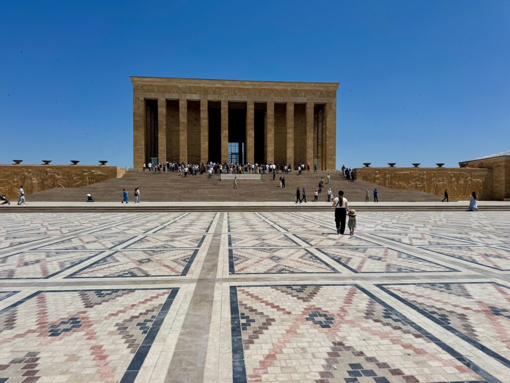Taylan herds us on a 45 minute guided tour pointing out the most significant parts of the pre-Roman collection. I love the visual of museums but most often, the dates and history elude me, floating in one ear and out the other. The visual sticks with me and I immediately relate the impressive Assyrian Bull and Lion Friezes in the Louvre to what we are seeing here. We have another delicious hour to explore the museums collection on our own. Art and I wander glass cubes of goddess figurines, tiny Alisar Assyrian tablets and impressive bronze cauldrons. We rest in the terraced garden before boarding our bus for the hour drive to Ataturk’s Mausoleum.