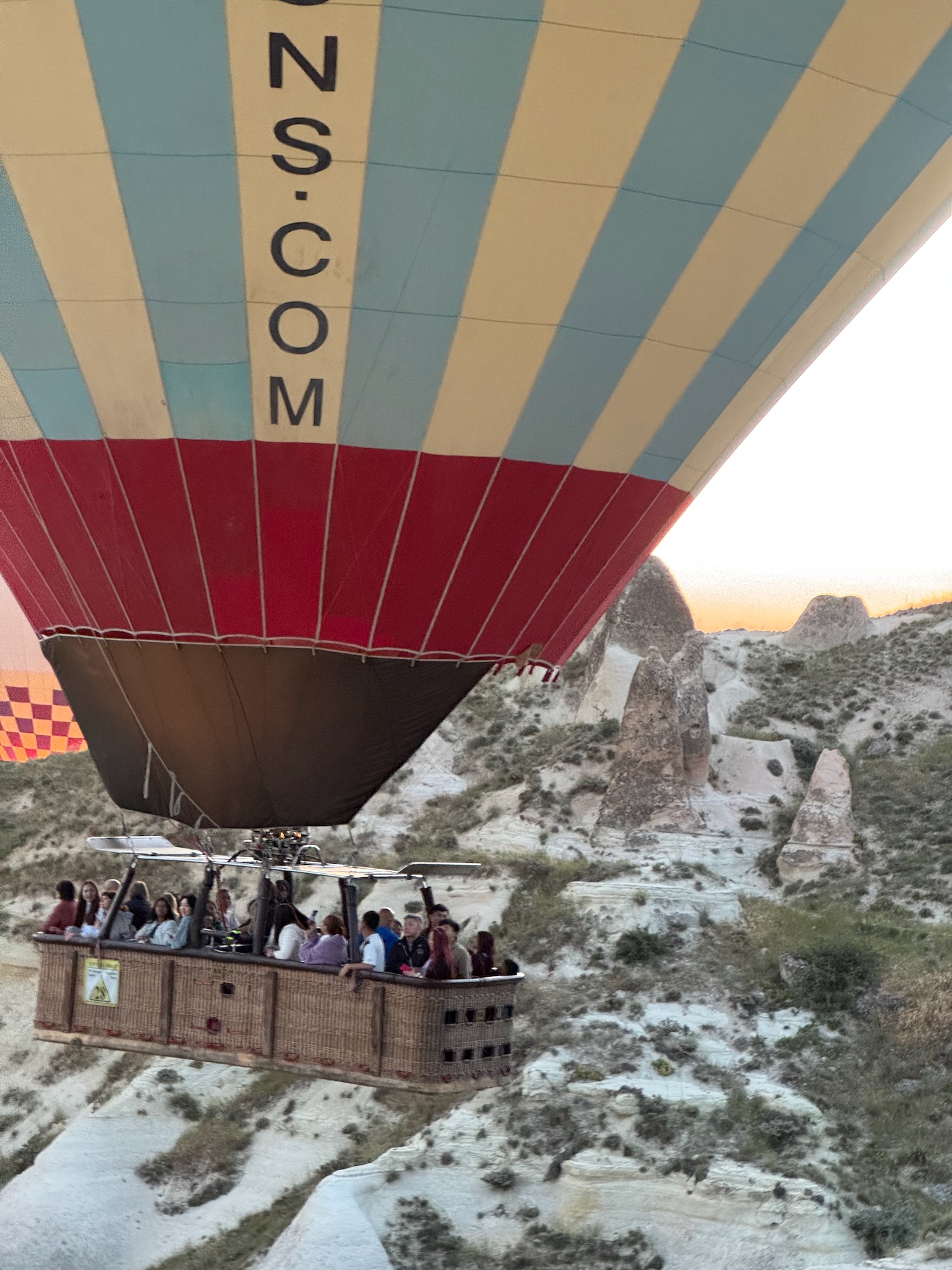 Almost all of our tour group has signed up for the optional hot air ballon ride for 210 Euros each. Only a few acrophobic or claustrophobic people have opted out. Two vans pick us up and we drive 30 minutes in the darkness to a hilly site outside of the village. We are deposited on empty spot on a rocky grass field. Even more than the ride itself, I am excited about the process of launching a balloon. It’s still dark but as my eyes adjust I see other groups of tourists gathered in the field and each group seems to have a limp balloon reclined on the ground nearby. Within minutes, many of these balloons begin to inflate and I hear the exciting whoosh of air as huge propane burners pump hot air into the balloons. Dozens of spots of fiery light dot the field and balloons glow in the dark, their colorful company logos becoming visible. Our trailer with our balloon is no where to be seen and I begin to worry. Where is our promised balloon? I am anxious more for the ballon company than myself. I relate all this to setting up a Marty Magic booth in the dark and think that “I would never be late to set up a show!” Minutes later our pickup truck and trailer arrive and I watch with fascination as the 4 man crew quickly unload, tether and inflate our balloon. Flames whoosh, our balloon grows quickly and we are not late for our launch. The balloon carries 24 people and is divided into 6 egg carton type sections, each accommodating 4 passengers. Our balloon is soon tugging at its tethers and we are told to get inside. Art and many of our group easily climb aboard. Someone brings a step ladder over, I climb up and am hoisted from behind and Art pulls me from within. I am suddenly standing securely within our egg carton section for 4, the rim of the basket around armpit height. The grey morning light creeps over the fields and we are airborne along with a hundred other colorful balloons. Below is an alien landscape of eroded cliffs sculpted by wind and water over centuries. Many of the tufa cliffs are perforated with caves that I know we will get to explore later today. The landscape is grey and tan with rivulets of green and patchworks of cultivated farm land. I see the impossible fairy chimneys with boulders precariously balanced at the tops of their eroded pinnacles. Colorful balloons like ours drift with the wind and we watch the sunrise. The sunrise fades into a grey dawn and we float in limbo watching the landscape below and the doing our best to absorb and lock this magical experience into our memories.