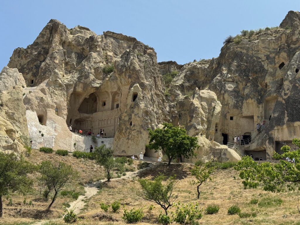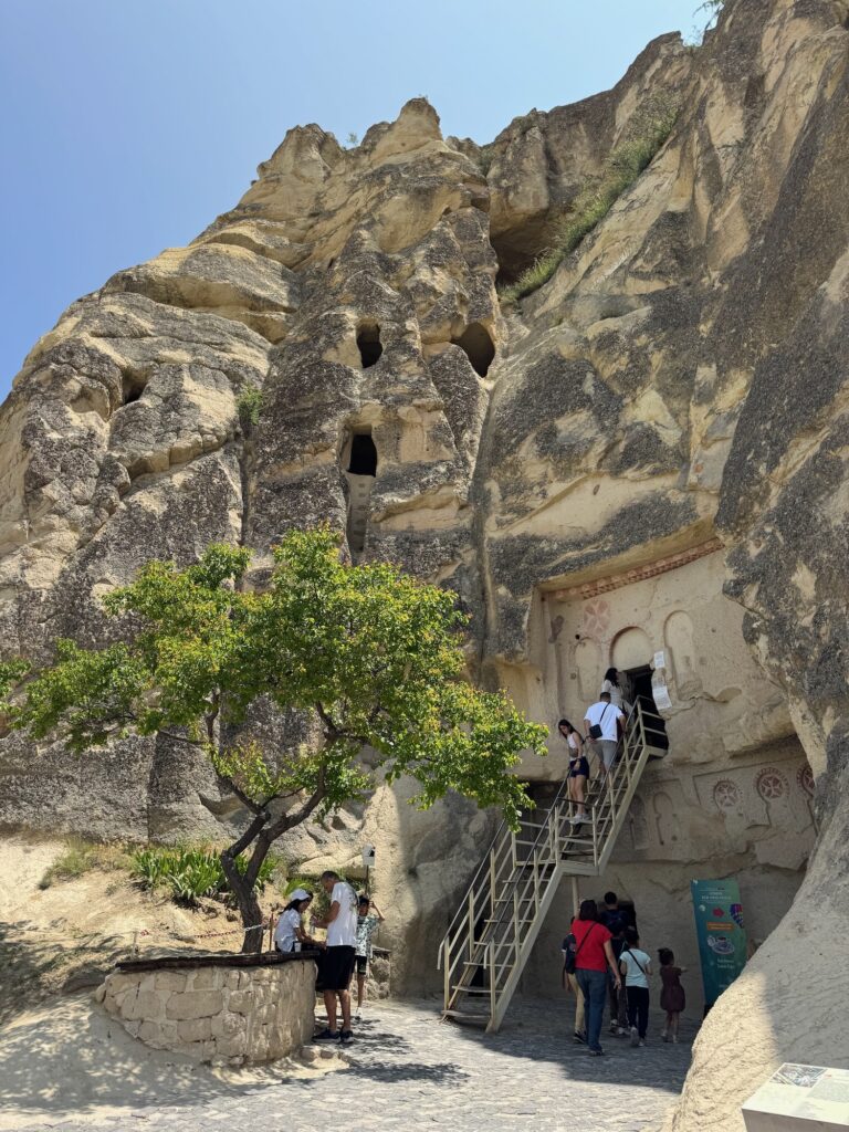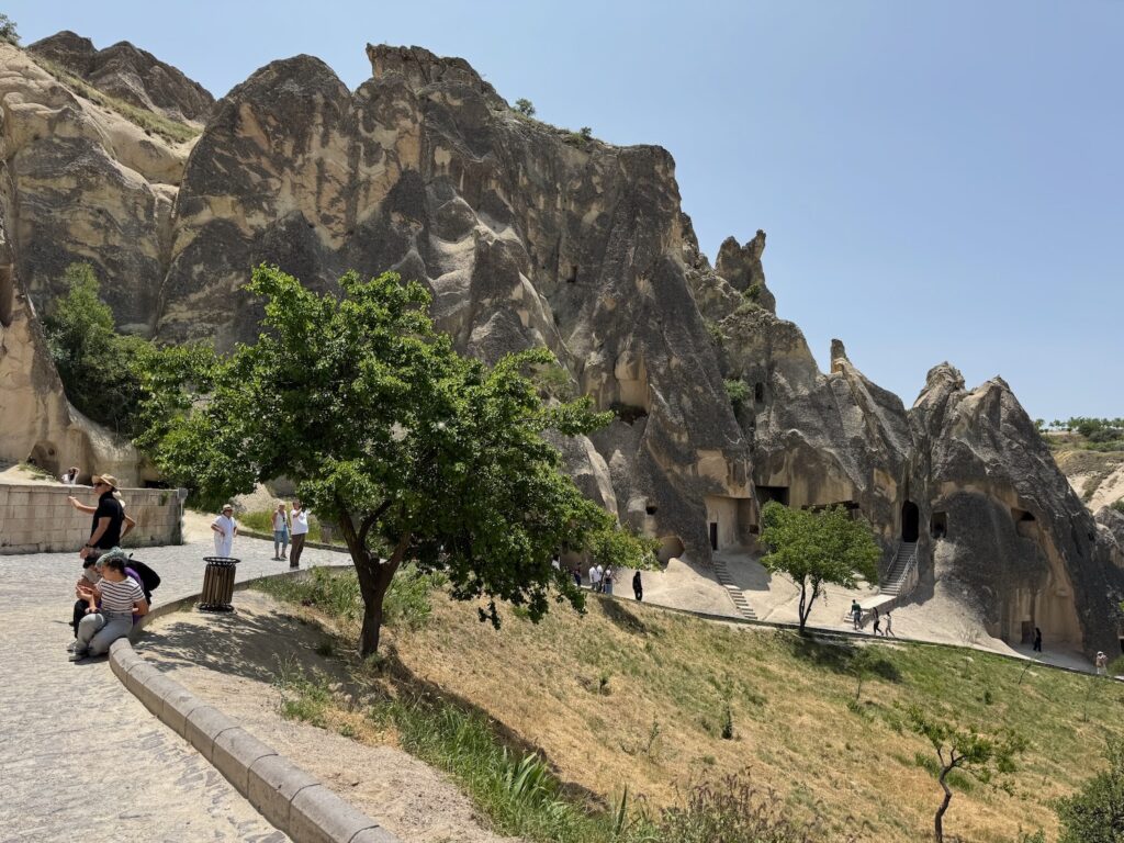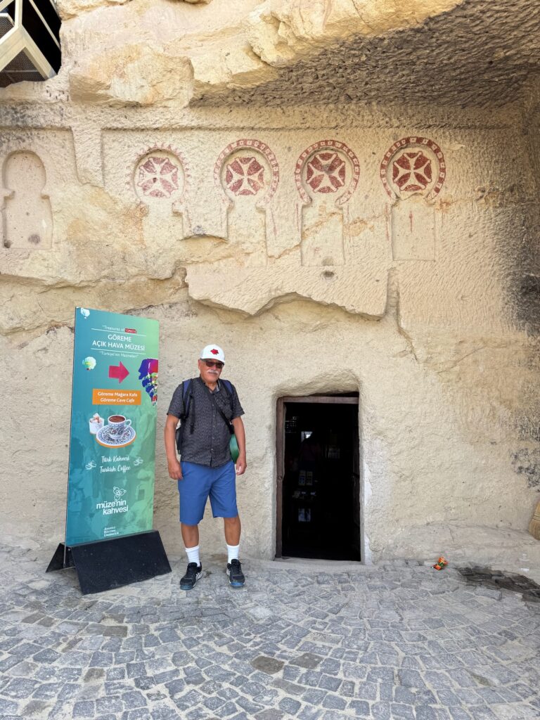 After our 45 minute walk of Mustafapasa Village we board the bus for the short drive to the Open Air Museum in the Monastery Valley of Goreme. By 11:30 A.M. we are hiking towards the entrance. It’s hot already and I look with dismay at the long uphill path we have to walk. There are multiple early Christian monasteries and churches carved into the tufa rock walls. Many of the interiors have detailed fresco paintings on the walls and ceilings. We climb many staircases to access the various cave churches and monasteries. Two other caves that we enter have long tables with benches carved into the rock floor. I think of the complexities of feeding everyone. It is obvious that this is and was a fertile valley so the area was a thriving village of farmers, cooks and every possible trade needed to support the chain of supply. Incredible effort and manpower would have been needed to supply water, provide sanitation and to feed those who feasted at these in-ground banquet tables. We have several hours to explore the area. I am surprised when I see a Cafe sign outside one of the lower cave entrances. It’s cool and dark inside and I rather want to sink onto one of the worn pillows and pay the inflated tourist price for a cup of coffee. Art demurs and we explore more of the caves before returning to our bus.
