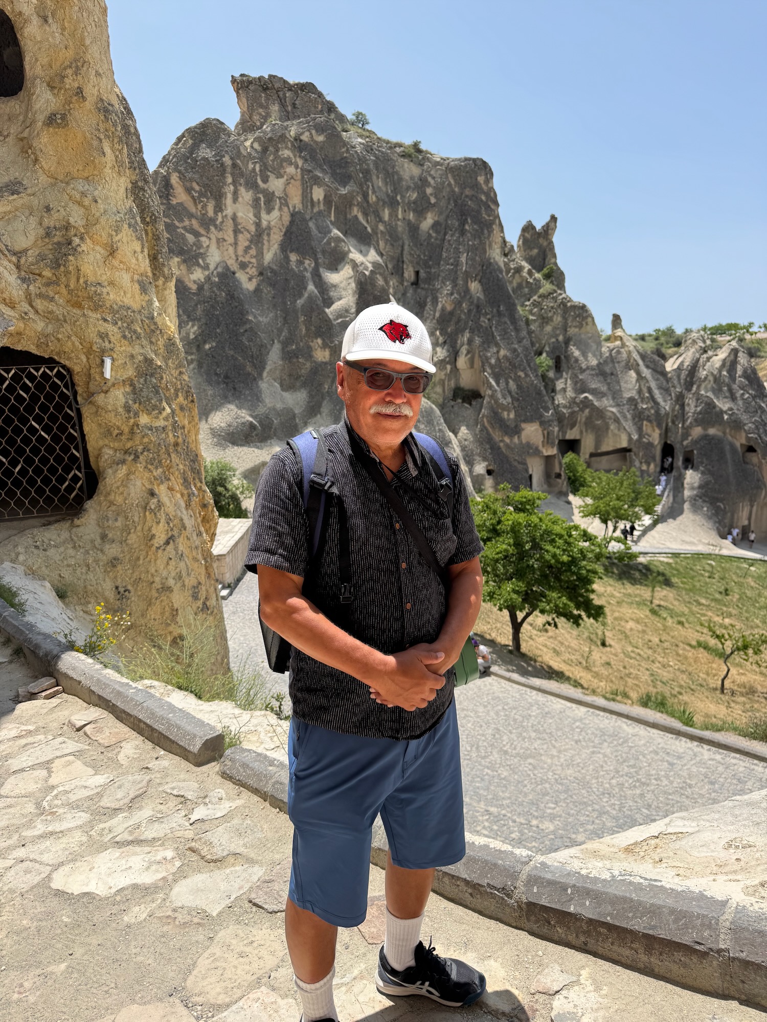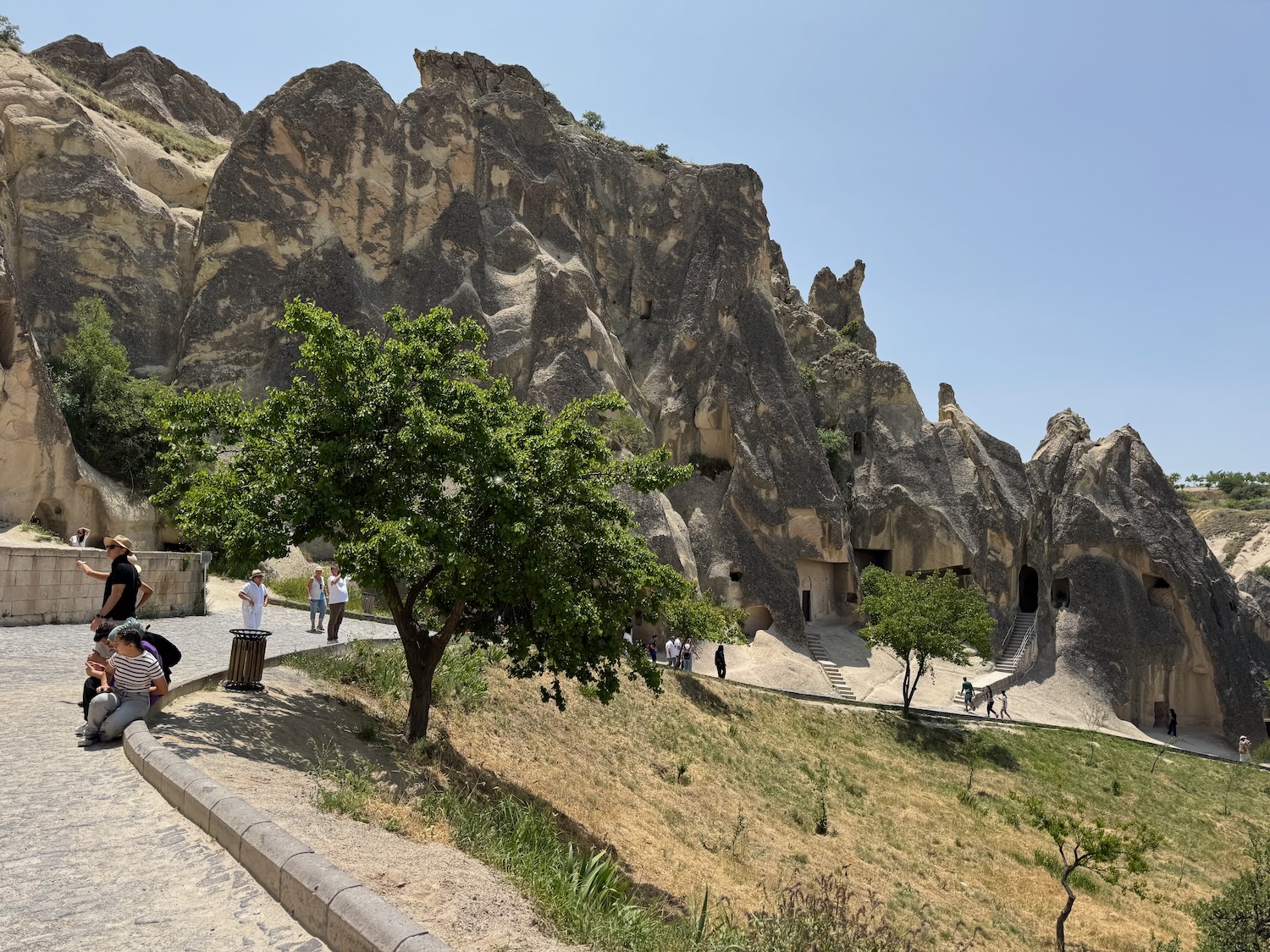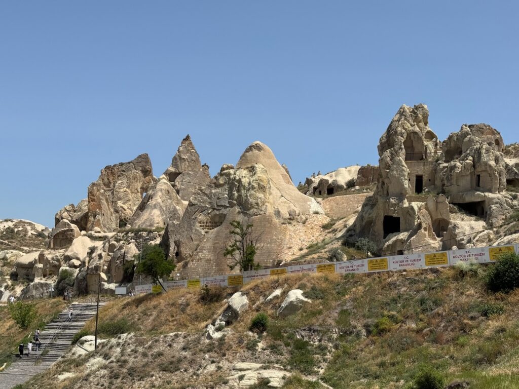 After our 45 minute walk of Mustafapasa Village we board the bus for the short drive to the Open Air Museum in the Monastery Valley of Goreme. By 11:30 A.M. we are hiking towards the entrance. It’s hot already and I look with dismay at the long uphill path we have to walk. There are multiple early Christian monasteries and churches carved into the tufa rock walls. Many of the interiors have detailed fresco paintings on the walls and ceilings. We climb many staircases to access the various cave churches and monasteries. Two other caves that we enter have long tables with benches carved into the rock floor. I think of the complexities of feeding everyone. It is obvious that this is and was a fertile valley so the area was a thriving village of farmers, cooks and every possible trade needed to support the chain of supply. Incredible effort and manpower would have been needed to supply water, provide sanitation and to feed those who feasted at these in-ground banquet tables. We have several hours to explore the area. I am surprised when I see a Cafe sign outside one of the lower cave entrances. It’s cool and dark inside and I rather want to sink onto one of the worn pillows and pay the inflated tourist price for a cup of coffee. Art demurs and we explore more of the caves before returning to our bus.