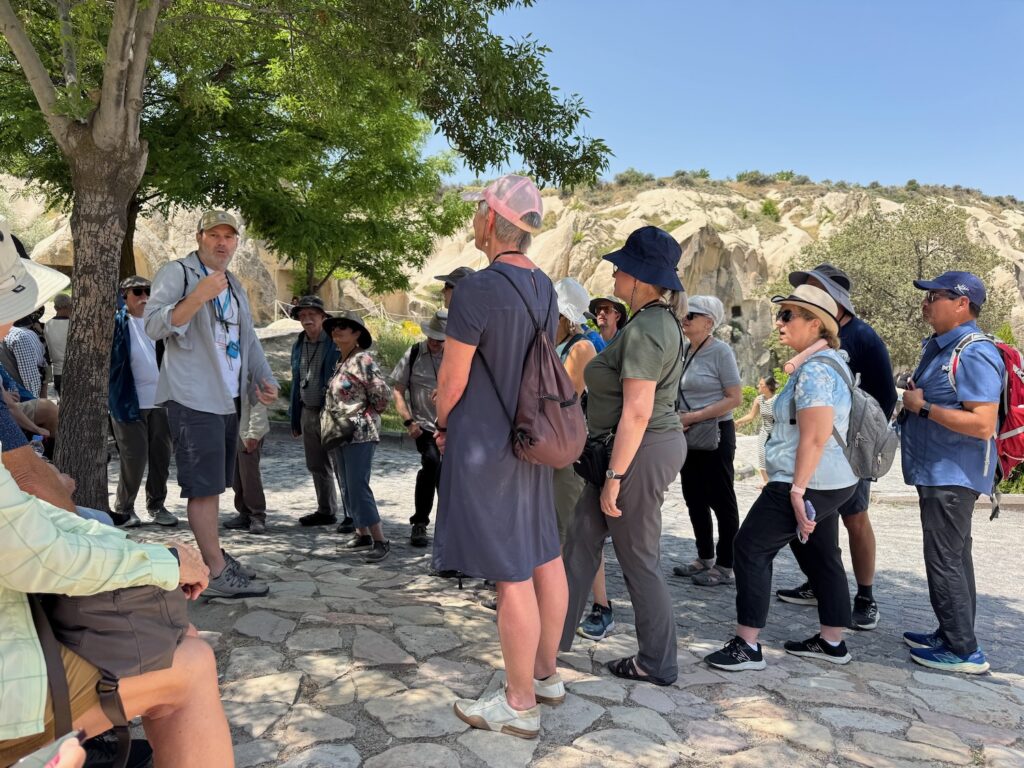 We meet in the lobby and Taylan distributes headset receivers to each of us so that he can broadcast information to our group as we walk. I remember enjoying this unobtrusive method of guiding on our eastern European and St Petersburg trip in 2019. We will not be following a waving flag like ducklings and he will not need to shout information over a crowd and disturb others. We are instructed to all pick ‘buddies’ that are not your spouse and our group will do buddy checks many times each day. It’s a great system and if applied will prevent any couple being left for shark bait off the coast of Australia. https://en.wikipedia.org/wiki/Deep_Water_(2022_film)
