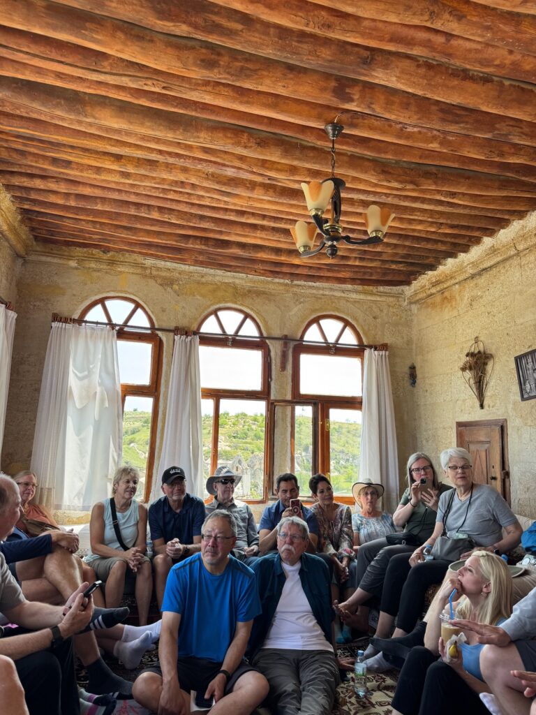 28 of us gather in a small room off the main dining room. Plates of cookies are on each table. Taylan, a mid 40’s Turkish man is our English speaking guide. Everyone is curious about who is on our group. Half the group is older, about Art’s and my age give or take a few years. There are a few younger couples who at first seem out of place and 4 single travelers in their late 40’s or early 50’s. At first I don’t think I will like our guide but we will grow fond of him and form bonds with many of those on the tour. During our meet and greet, we have a minute each to introduce ourselves and give the reason for choosing the Rick Steve’s Turkey tour. I am the only one who has traveled to Turkey before and some people gasp when I say I visited nearly 55 years ago as a backpacker with no money. This trip will make one couples trip their 8th and there are only a few Rick Steve virgins. This will be our second. Many of the introductions are clever and we visit briefly before being dismissed to our rooms and instructed to meet at 5:00 P.M. for our walk and orientation of the old town.