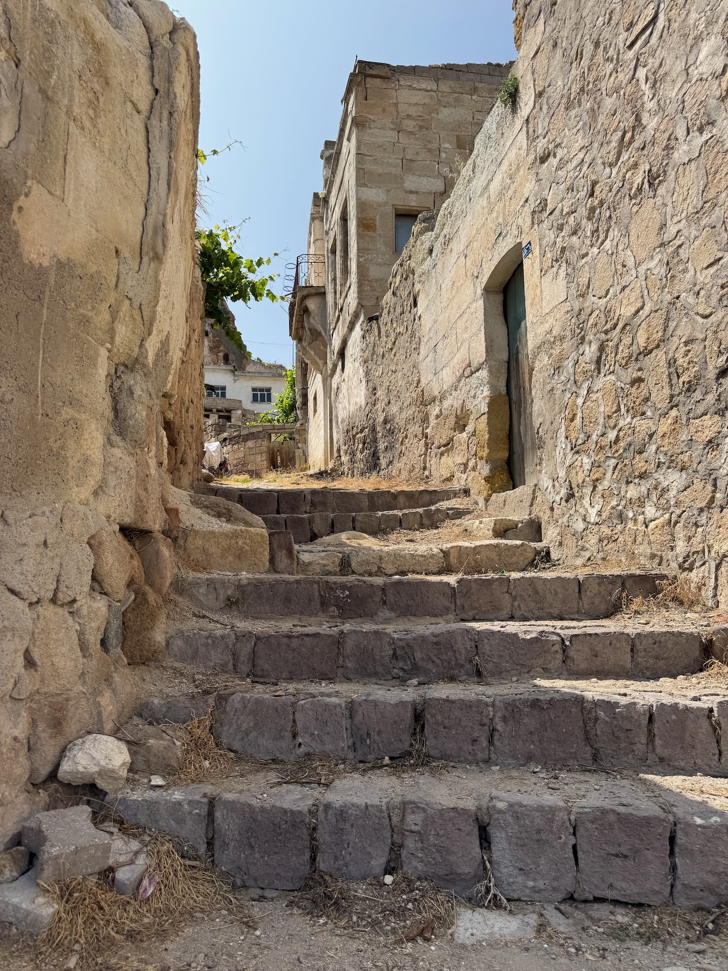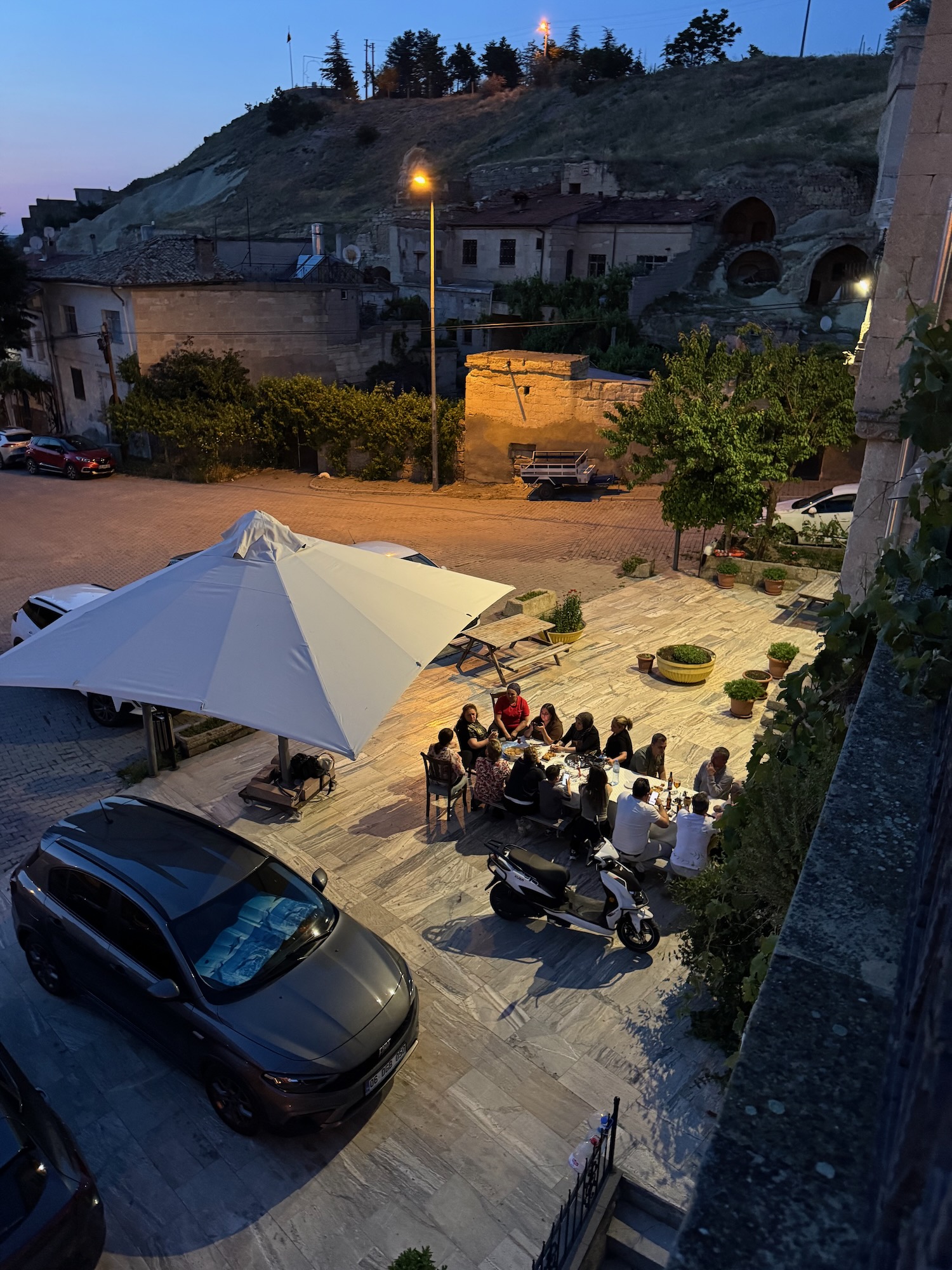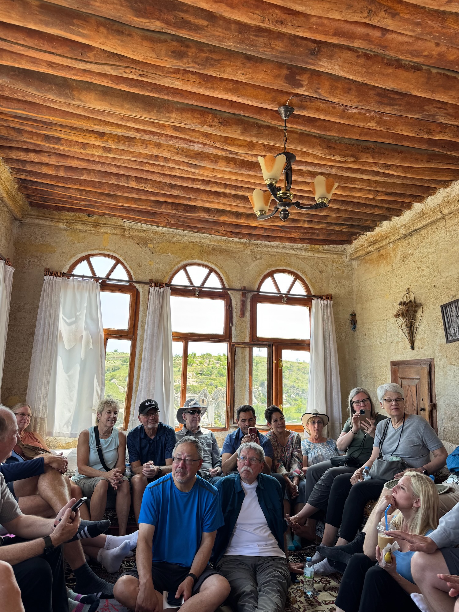 The family run Greek House restaurant is lovely in the authentically decrepit way of a restaurant that has been handed down over generations. Our group sits at two long banquet tables inside the old building. There are some table outside where locals sit and visit. We are told that many are family members, recently arrived to celebrate the Eid al-Adha holiday. Tonights dinner is a yummy lamb stew, a delightful change from kabobs. After dinner, our group is invited to poke around upstairs and enjoy the balcony view. We split up and some walk another block into the small village with a few cafes where families sit and visit. Art and I walk back to our hotel. We have a 4:00 A.M. pick up to drive for a hot air balloon ride over Cappadocia.