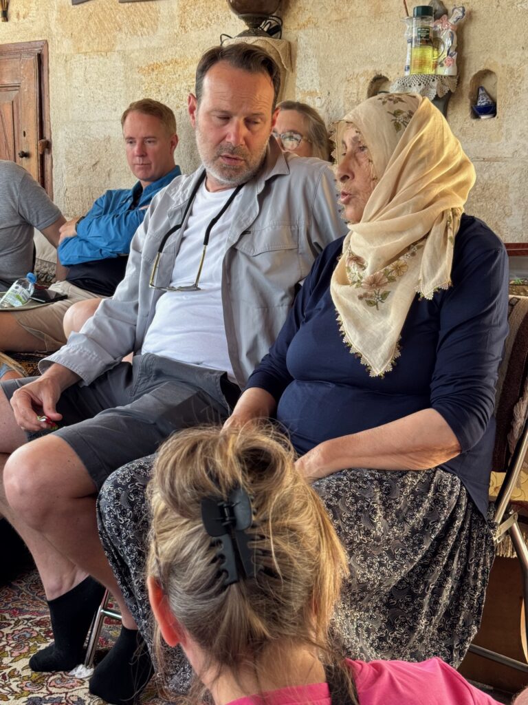 It’s nearly 2:00 P.M. before we arrive at the private home of a wrinkled old woman for a simple but flavorful lunch of beans, bulgur and salad. Our group of 28 crowd into a sunroom off her simple terraced house and she and her son serve us as Taylan translates for her as she talks about her life. Many of the members of our group, myself included, are as crinkly and smiley as she is. After lunch she pulls out some of her crochet work and offers it for sale. Several of the women in our tour buy a crocheted edged scarf or a babies sweater. I consider a sweater for our future grandson but come to my senses realizing how truly unsuitable it is and that I have little or no extra room in my suitcase. I do not want our son or his girlfriend questioning our sanity or taste. Our sanity is already in question.