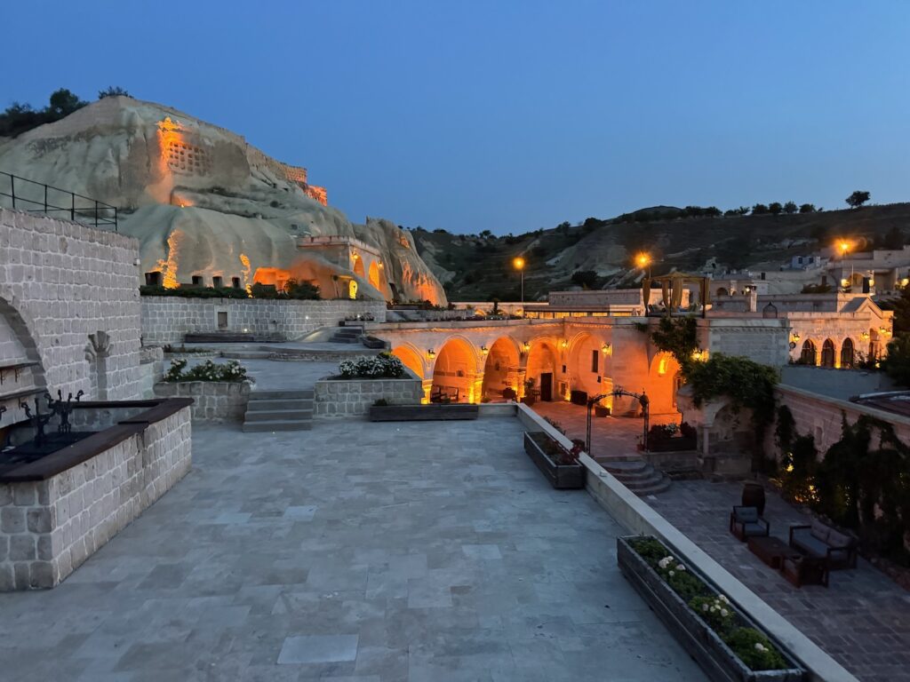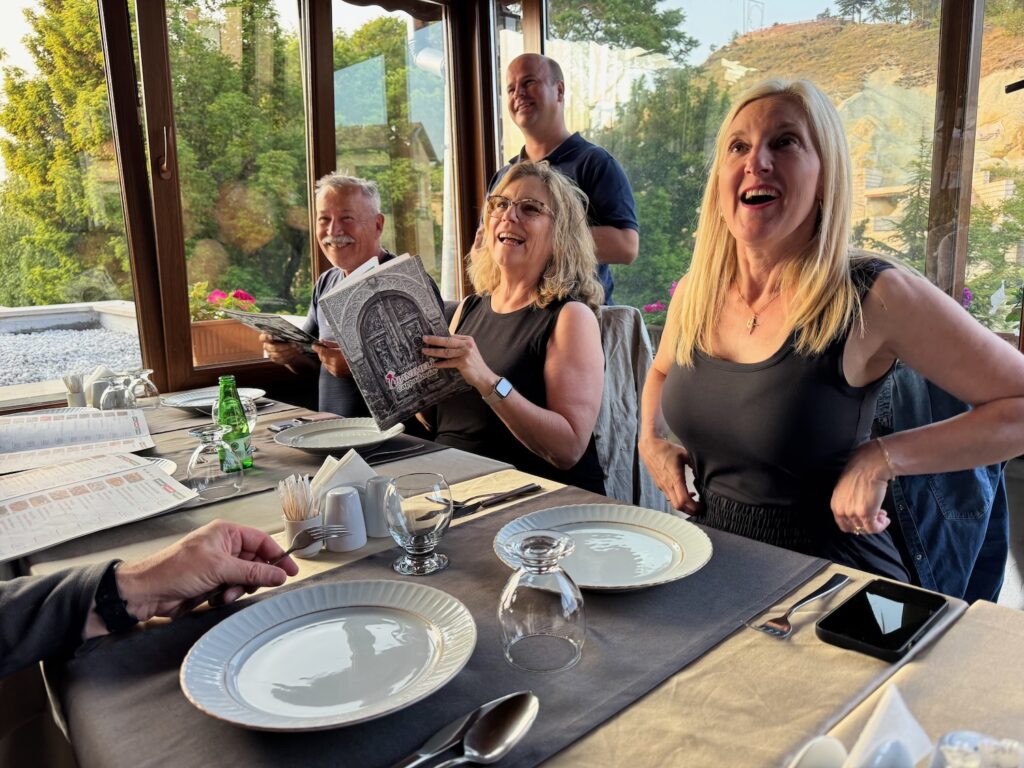 We arrive at a magical hillside bed and breakfast in Mustafapasa. Once again, room numbers and keys are distributed quickly to all of the couples and the few single travelers in our group. We know that on a Rick Steve tour, each room will be different; some large, others small, some up three flights, some with balconies, occasionally some with shared bathrooms. Art and I have won the lottery. Our spacious two cave suite with alcoves carved into the cliff walls is on the ground level with a luxurious spa tub bathroom. Two Turkish rugs are on the stone floor. I am aware that over the past 4 days, Taylan has observed all of his ducklings and is doing his best to accommodate our various needs. Although I wonder about what the views might be from the third terrace rooms, we will not need to climb stairs. Art and I sink into our spacious cave suite and but have little time to relax before doing an about change for a group dinner at a family restaurant a few cobblestone steps away.