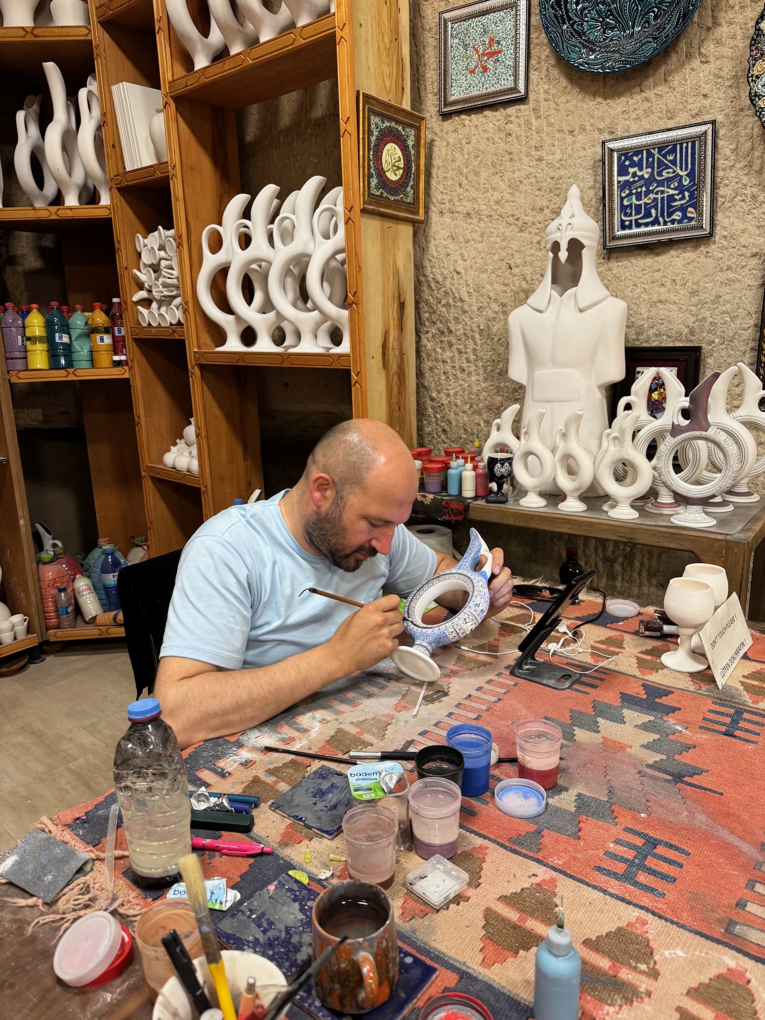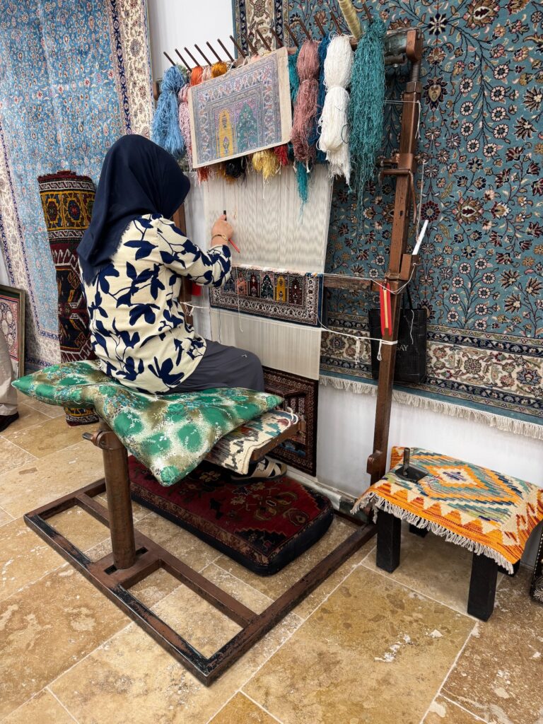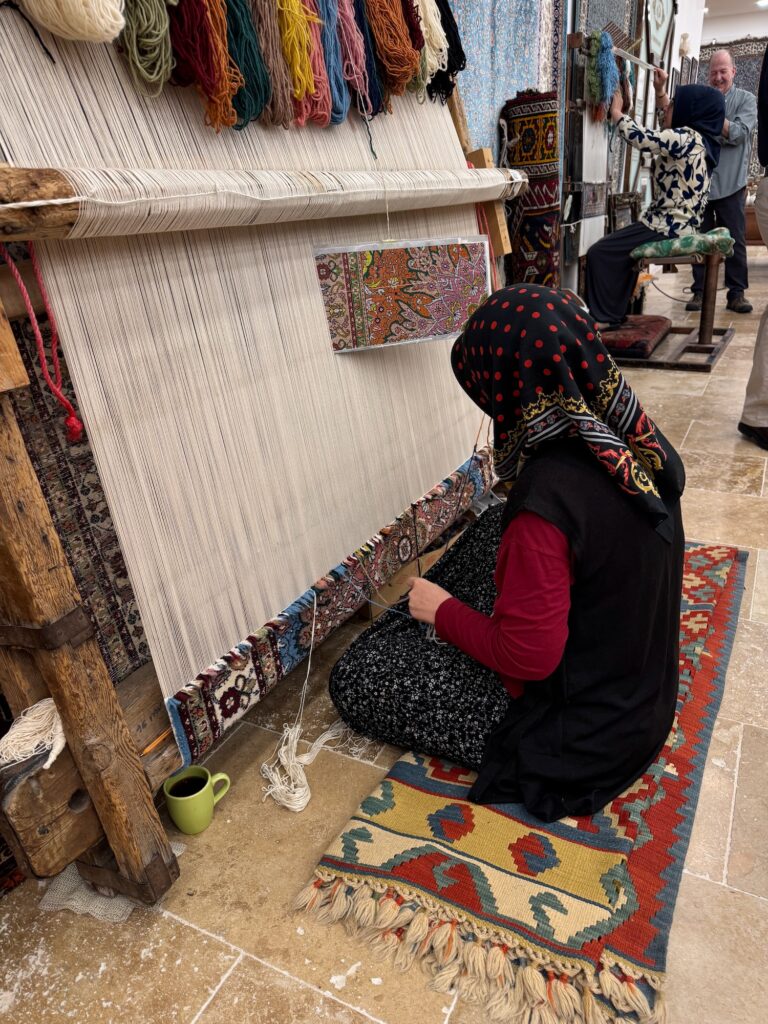 Rick Steve tours are not intended to be shopping tours but rather a peek into the local cultural and history. Even with the best intentions, there are grey areas. The next two excursions are optional but the majority of our tour want to visit both the Turkish carpet factory and the Aladdin’s Pottery studio. As a craftsperson and a seasoned traveler, I have seen many such places before and I know that there is always the sales pitch and a showroom visit at the end but I want to go to see process as well as the beautiful goods. Yesterday, Taylan told us that if anyone was interested in buying a carpet to know what size and color they wanted before hand. He also tells us that we should snap photos tomorrow of any we like because the choice will be confusing and overwhelming. I called John and have him measure the floor space in my office. If I were to succumb, I need a 5’ x 7’ carpet. The color is not much of a factor for me.