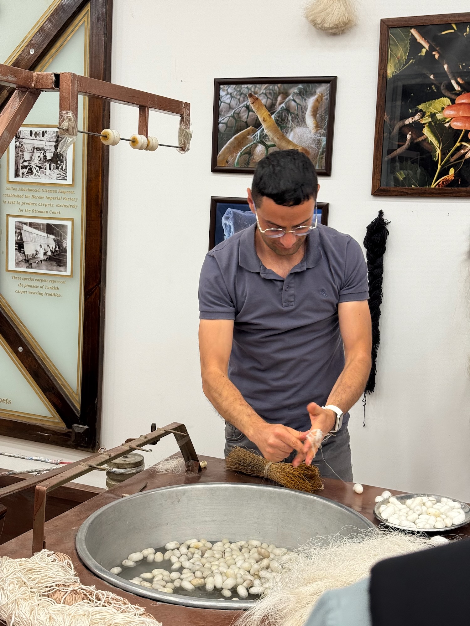 It’s a short drive between our hotel and the carpet factory. We arrive at the carpet weaving factory just before 11:00 A.M. As obedient students, we sit and listen to our Magic Carpet host as he explains the various materials that can be used and the relative time and expense between cotton on cotton or wool on cotton or silk on silk etc. Two women sit before two looms, meticulously tying and cutting knots as they painstakingly weave their rugs. We move to the silk worm demonstration table and watch another man unwind the silk from a hundred unfortunate silk worm cocoons that have recently been boiled alive to prevent them from hatching and breaking their valuable silk threads. These filaments of silk are twisted together to make thread and yarn. From there the silk is dyed and eventually woven into a carpet.