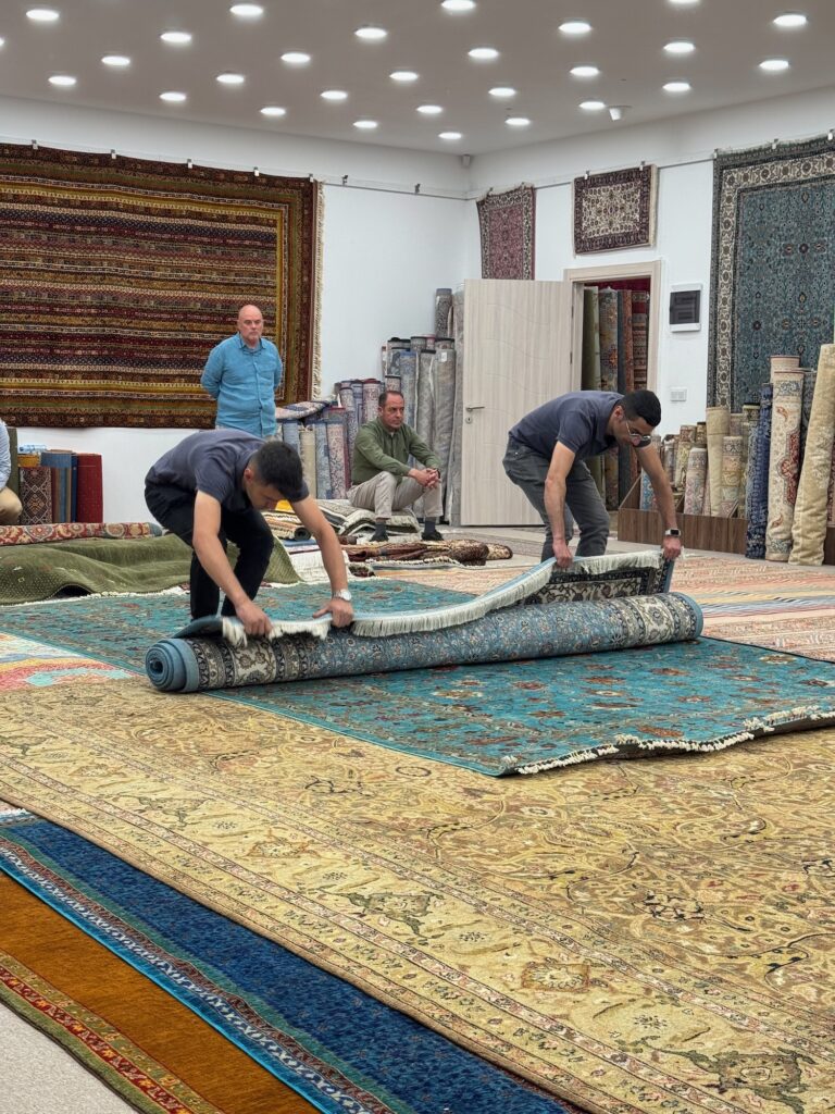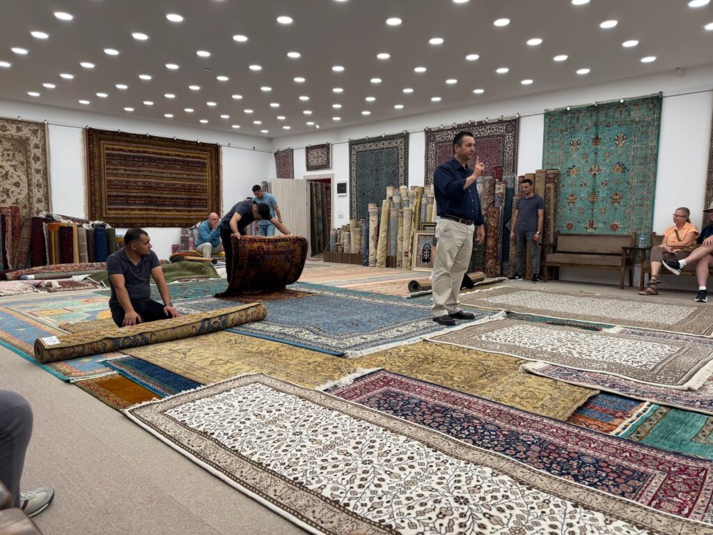 The educational part of the tour complete we are let to an immense room with stacks and rolls of carpet. We all sit around the room and they offer us Turkish tea, coffee, wine or Raki, a traditional Turkish anise flavored liqueur. It’s not yet noon so Art and I order tea but a few brave souls, Taylan included ask for Raki. The carpet show unfurls. Dozens of carpets are dramatically unrolled upon the floor and our host describes each one carefully but no prices are mentioned. A few of the first ones are kilims, flat woven rugs, not knotted rugs. The floor becomes a vibrant patchwork of color and when I see one carpet I particularly like, I take its photo and do a quick heel to toe measurement. My actions are not unnoticed by the attentive sales crew waiting by the sidelines. The show ends and it’s time for them to get down to business.