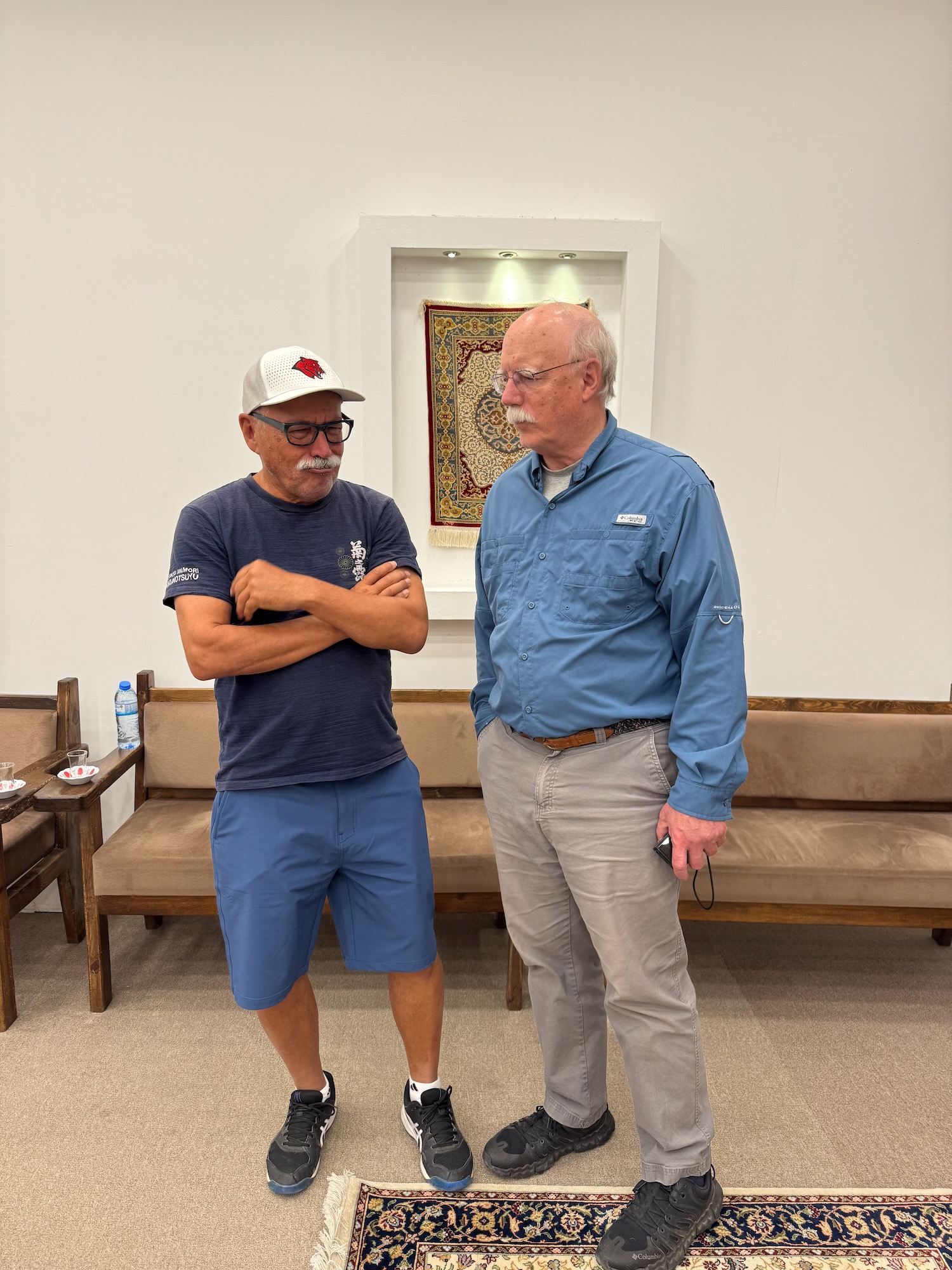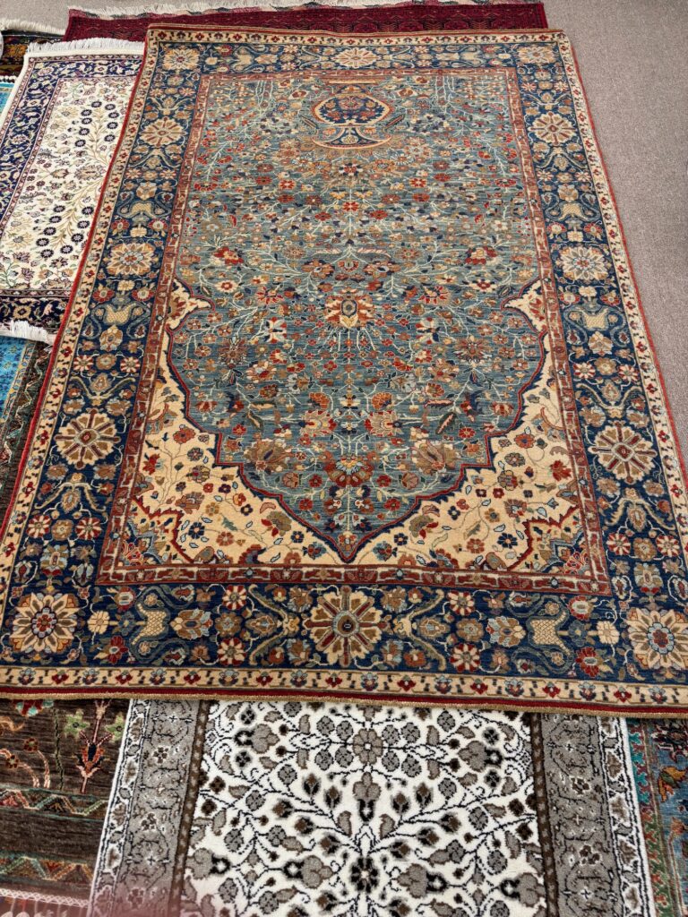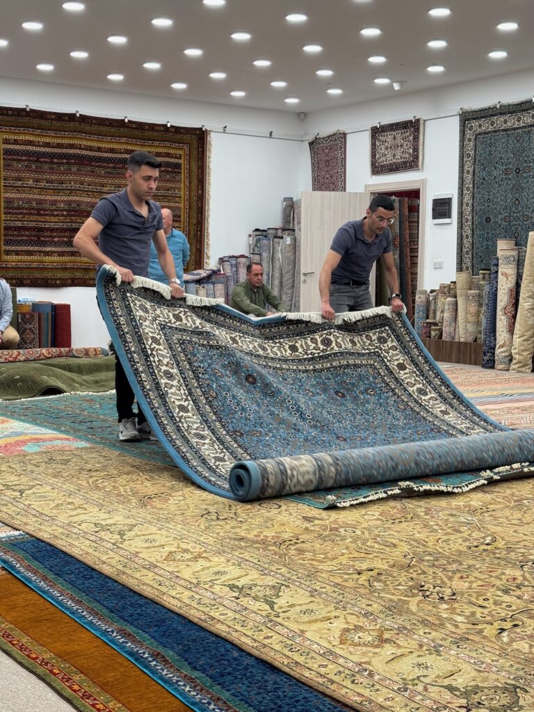 I’ve been in sales all my life and imagine the unspoken assignments between each of the sales team. “You Ahmet, take the woman who just took a photo of that carpet, I’ll take that couple in the corner, etc. etc.” It’s a game and a gamble about reading people but this showroom has a lot invested and they need to land a few big fish before our bus departs forever. I show my carpet pusher the photo on my phone and he unearths it from the layers of carpets spread on the floor. It is 5’ x 7’ with an intricate center medallion the colors of brick and blue with a cream background. It’s lovely and I am informed it is silk on cotton. I believe I am prepared to pay up to $1500 + the ambulance bill for Art to be rushed to the nearest hospital with a heart attack. I am subtly relieved when he tells me it is $22,000. It is so far beyond our budget that I laugh and think that I can step out of the game but ‘Ahmet’ is not one to give up easily. “What will you pay Madam? He offers it to me for $17,000. I chuckle again but he counters “Wait, let me show you some other carpets that are similar but less money?” I am simply not interested in playing this game but before I can return to the side lines to stand beside Art, Ahmet has already unfurled a few others. I finally escape to stand beside my husband but Ahmet’s eyes bore into me, following my every move. I avoid eye contact. Several other members of our group are engaged in potentially buying a carpet. I am fascinated and make the grave mistake to walk over to admire the various carpets Paul and Yu-Lin are considering. Ahmet must be a shape changer because every time I turn he is there proffering another carpet. I surrender to the sidelines again and soon enough Art and I spot an escape route and we slink out of the showroom to the safety of the parking lot. Back on the bus we learn that Paul and Yu-Lin purchased a carpet and Allie, purchased several as gifts for her children. We do not ask the prices.