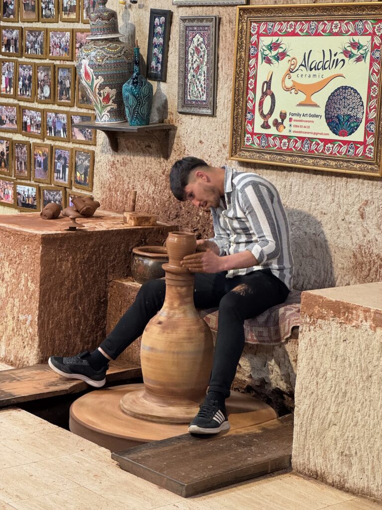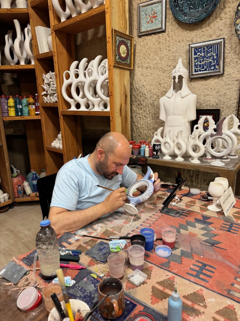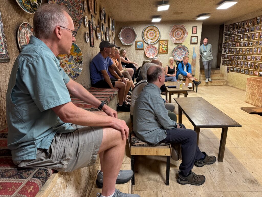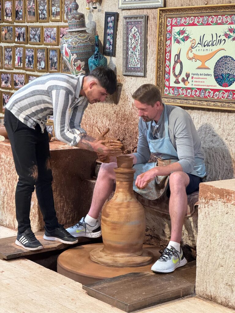 Our tour begins with a detailed explanation of the process and I watch two artisans at their work stations meticulously painting the ceramics. Before I became a jeweler, I was a ceramic major at University of Redlands and I understand the process and enjoy the simplified demonstrations of the craft. A woman meticulously paints a medusa head on a platter and a man paint detail onto a wine decanter styled from the ancient Hittites. Next, we are ushered into another room where we sit on benches along the wall and shown a kick wheel throwing demonstration. Drink orders are taken and it is now afternoon so many in our group accept wine or Raki. The young man demonstrates the process and expertly throws several pots and then asks if any of us wish to try? I want desperately to get my hands on a spinning lump of clay but I could never overcome my shyness and do this in front of a group of people. Garth, a member of our tour volunteers to try and with some help throws a decent if off kilter vase. He has fun and we all enjoy his showmanship and congratulate him on a pot well thrown. We find out later that his hobby is turning wood on a lathe.