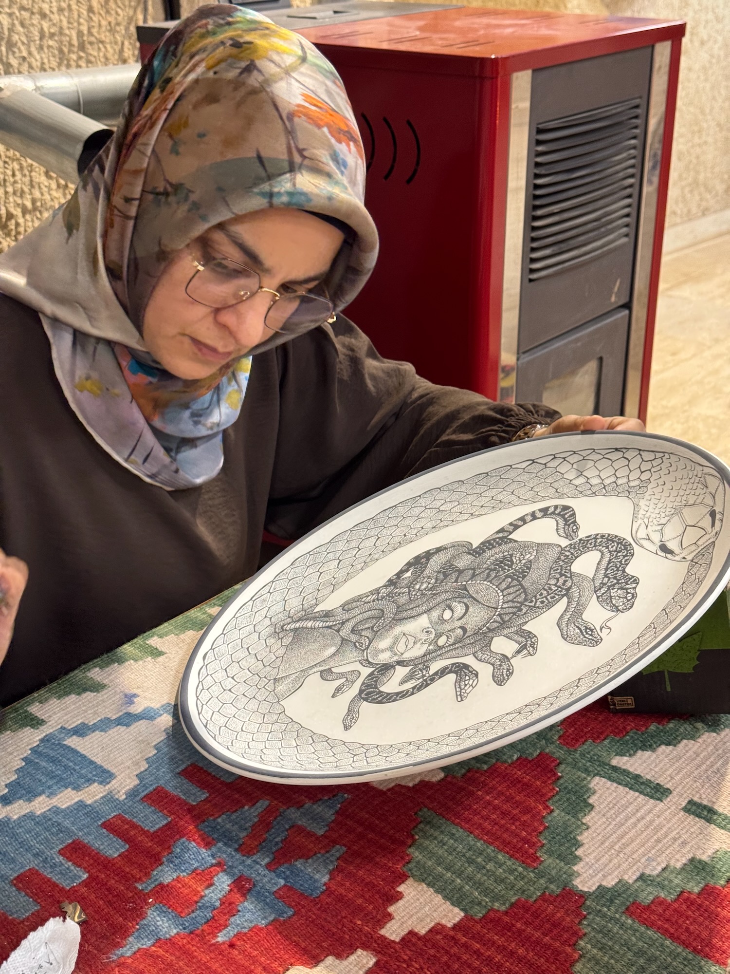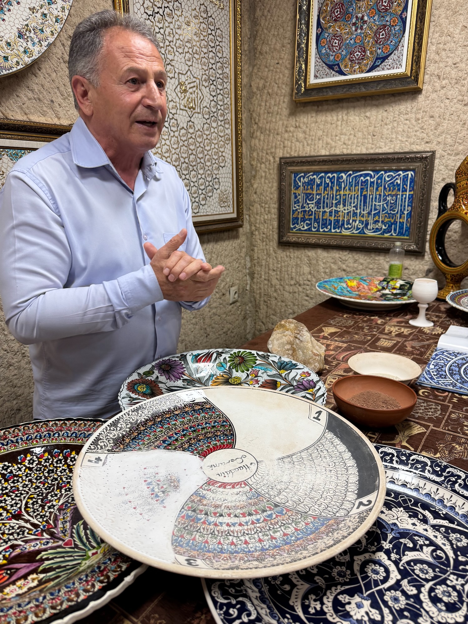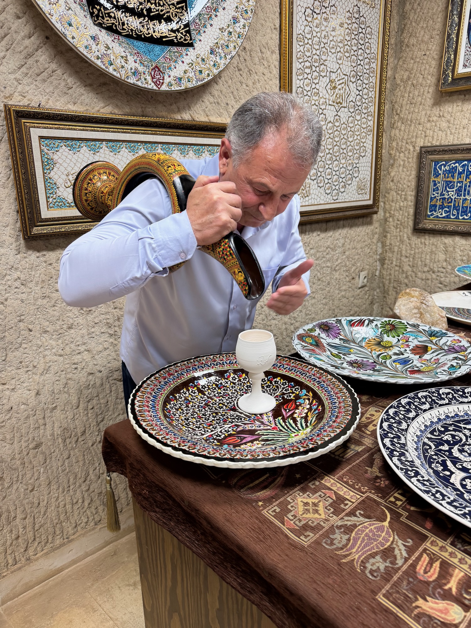 Our tour begins with a detailed explanation of the process and I watch two artisans at their work stations meticulously painting the ceramics. Before I became a jeweler, I was a ceramic major at University of Redlands and I understand the process and enjoy the simplified demonstrations of the craft. A woman meticulously paints a medusa head on a platter and a man paint detail onto a wine decanter styled from the ancient Hittites. Next, we are ushered into another room where we sit on benches along the wall and shown a kick wheel throwing demonstration. Drink orders are taken and it is now afternoon so many in our group accept wine or Raki. The young man demonstrates the process and expertly throws several pots and then asks if any of us wish to try? I want desperately to get my hands on a spinning lump of clay but I could never overcome my shyness and do this in front of a group of people. Garth, a member of our tour volunteers to try and with some help throws a decent if off kilter vase. He has fun and we all enjoy his showmanship and congratulate him on a pot well thrown. We find out later that his hobby is turning wood on a lathe.