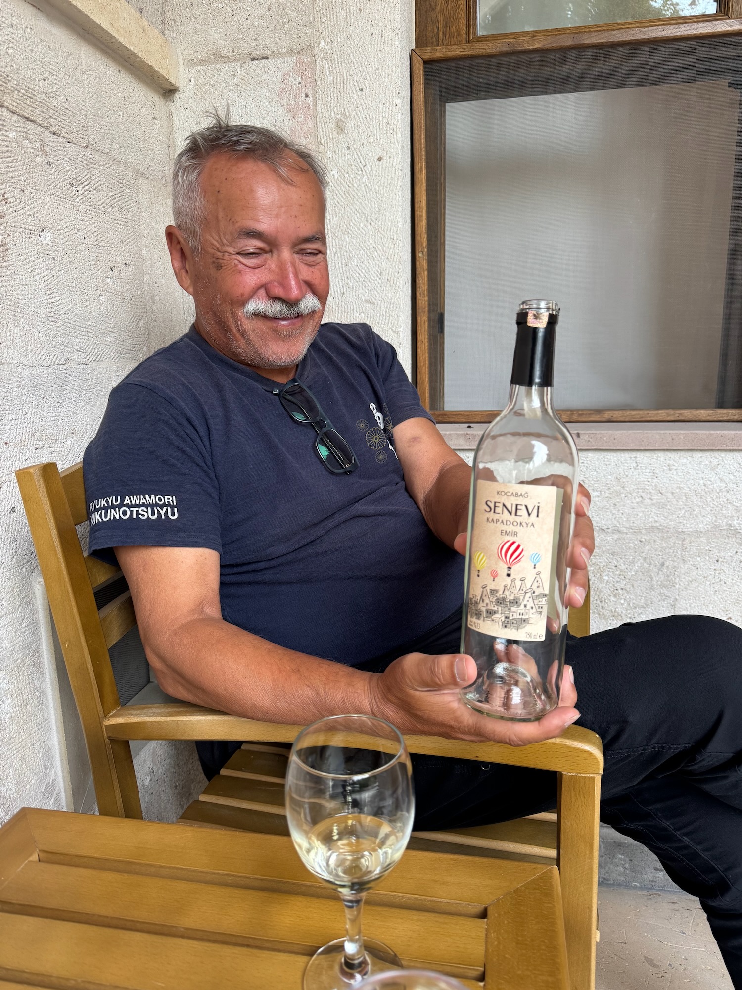 We have this late afternoon and evening to ourselves. Art and I rest for an hour and then decide to walk into the village. Several from our group are gathered in the courtyard enjoying glasses of wine from the hotel bar. We tell our friends that we are going to look for a bottle of wine in the village and Kathy enthusiastically calls to us and asks for us to buy a bottle for them too! We walk the few short blocks to the village center. There are several cafes with a scattering of occupied tables spilling onto the sidewalks. We walk past a few tourist souvenirs shops and disappoint the merchants by passing quickly by leaving only a smile. Finding a market or liquor shop is more challenging but then we spot a tiny market with a soda case outside and I spy several wine bottles sitting in the dusty window. The shop is tiny and therefore crowded. A man is buying cigarettes and a few kids beg their parents for sweet and salty snacks. When our turn comes, we point to the dusty window display and to an upper shelf where we spot a few other dusty bottles. Art, in his best Turkish, conveys that we want a cold bottle of white wine. The merchant sets several bottles on the counter and we shop by label and price. Naturally, the bottle with the hot air balloon label wins our vote and it’s the same price as the others with less attractive labels. Miraculously, the man has two of these chilled and we pass our 1200 lire over (about $32) and leave the tiny shop triumphant.
