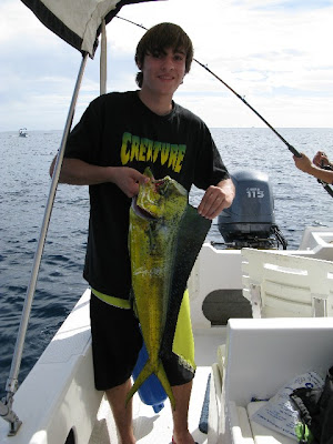 As the morning warms we shed our layers, get a few more nibbles, but hook nothing. I am worried that John might not catch a fish. Pata motors the panga to a different fishing spot and another two hours pass with little action. Suddenly, Art gets a bite, and seconds later, John too has a fish on his line. Both have caught 3 foot needle fish that put up a good fight. We ask Pata to release them and he aptly removes the hooks from their long serrated snouts and pushes each forcefully back down into the sea, forcing water through their gills so that they survive. Each fish swims off, a silver blue streak beneath the water. In the next 30 minutes, Art and John catch three more needle fish, all of which we release. Our fish monitor starts to indicate more action and Pata chums the water, tossing a few of the live sardines overboard. John gets another bite, that we think is a Dorado, not another needle fish. John patiently works the fish, letting out line, pulling up and back on his pole and reeling in; releasing more line, pulling up and back and reeling in. We see the fish jump and confirm that it is a Dorado. A few minutes later, Art also hooks a Dorado. Both of my men have an excited twinkle in their eyes and for the next 45 minutes, I watch and take photos of the process. John brings his fish in first and I am again awed by the beauty of this pelagic fish, glistening gold and pink with brilliant blue fins. Dorado is a fitting name for this fish, better known back home as Mahi Mahi. When the fish is along side of the boat, Pata quickly hooks it and clubs the fish to kill it quickly. This shocks me and I turn away, saddened again that we have caught this fish. Art plans to release his fish, but when he