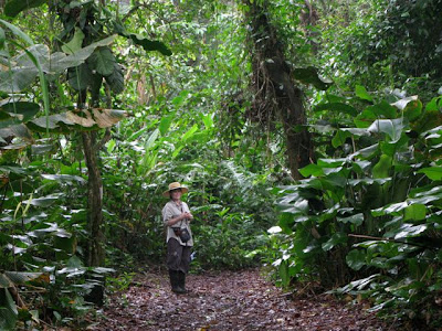 We are up shortly after 5:00 A.M. slicing potatoes and onions and cracking eggs for breakfast. Louis has promised to bring me coffee this morning and he arrives, shortly before 6:00 A.M. with a coke bottle filled with strong tepid coffee. Tabra doesn’t drink coffee and I was anxious that I would not enjoy our jungle hike without my morning cup. I add milk and he walks out to his motorcycle, pulling out a knotted plastic bag containing humidified sugar. I drink the thick sweet brew gratefully, flashing back to an early morning hike in Flores, Indonesia, when John and I hiked with a guide to a viewpoint to watch the sunrise over Kelemeto Volcano. A grizzled old man, in a dirty and worn sarong hiked miles each morning to sell coffee to those making the trek to watch the sunrise. That cup of coffee, and today’s coffee are two of the best cups I’ve ever tasted. We share our breakfast with Louis and at 6:30 A.M. we lock the cabin to explore Tabra’s jungle property. We start down along a dirt road, Louis leading the way, the morning warm and humid already. Tabra inquires about the landmarks and the boundaries of her property and he points and gestures, mostly to her satisfaction. He caretakes for several property owners in the Turrubaras area. We leave the road, hiking downward. The upper part of her property is more forest than jungle, but Louis carries a machete and slices through vines and underbrush to clear our pathway. We encounter several shallow, narrow streams, wider than I can jump, and he places his foot in the center of the stream, and motions me to use the toe of his rubber as a stepping stone. As we descend, the jungle grows more dense and we scramble down the steeper embankments, gripping tree branches, vines, and often an outstretched hand for support. Tabras’ property is 35 hectors, or approximately 85 acres. There are several springs on her property and a year round river with monumental boulders and waterfalls, that are impressive, even at the end of the dry season. Louis cools off with a swim in the river, but Tabra and I are not inclined to bare our thighs to this young man, so we rest on cool bounders and take photos. I find the return trip easier than the descent and we stop to observe insects, mushrooms and seed pods on the way home. The humidity hangs heavy as the morning heats up and we are drenched with sweat by the time we return to the cabin 4 hours later.