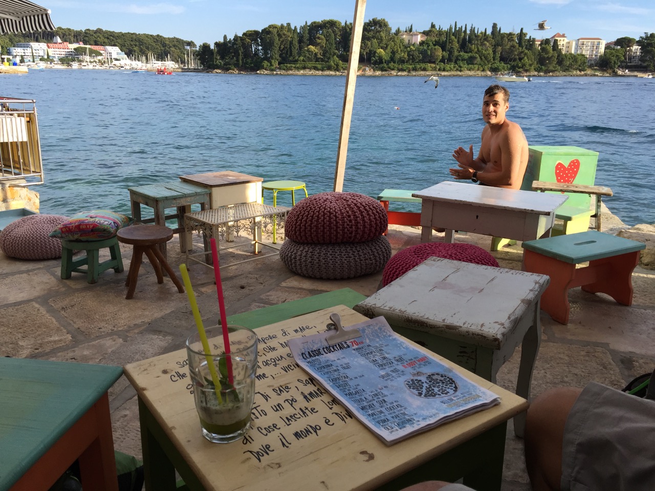 An hour later we stroll down towards the harbor where John swims off the rocks. There are many cafe bars with terraces overlooking the sea below. Art wants a gelato but a “Greek style” cliff side café beckons Kate and me. While Art wanders the old town, Kate and I sit propped on cushions in the cool shade of the cafe just steps from the water and order frothy mint lemonades. Thirty minutes later, I walk up to the top of the street to meet Art and to inform John of our whereabouts. Art joins us in the cafe and John swims up to the café and hauls himself onto the terrace, drips dry and orders a drink.