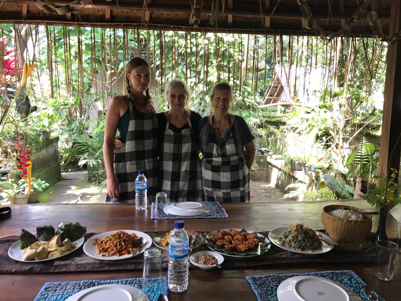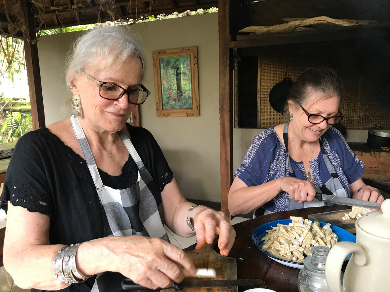 We move from the garden to her outdoor kitchen where cutting blocks and bowls of herbs await us. She patiently instructs us in how to make corn fritters, tuna in coconut milk, Tum Tehu, (steamed tofu in banana leaf), Sweet Tempe and Jukut Urev, mixed vegetables with raw grated coconut. We spend the next 2 ½ hours chopping equal amounts of garlic and shallots and a variety of red peppers. We then take these spices and with mortar and pestle grind into a thick paste. With my hands, I squeeze fresh coconut mixed with water to make coconut milk and Alisha kneads rice flower into fresh corn and the spicy paste we have made. Tabra mashes and mixes the tofu with a different combination of a spice paste and our instructor shows us how to make banana leaf pockets into which we stuff the tofu mixture.