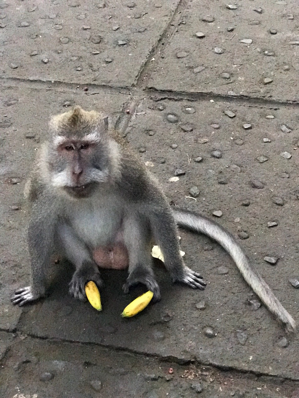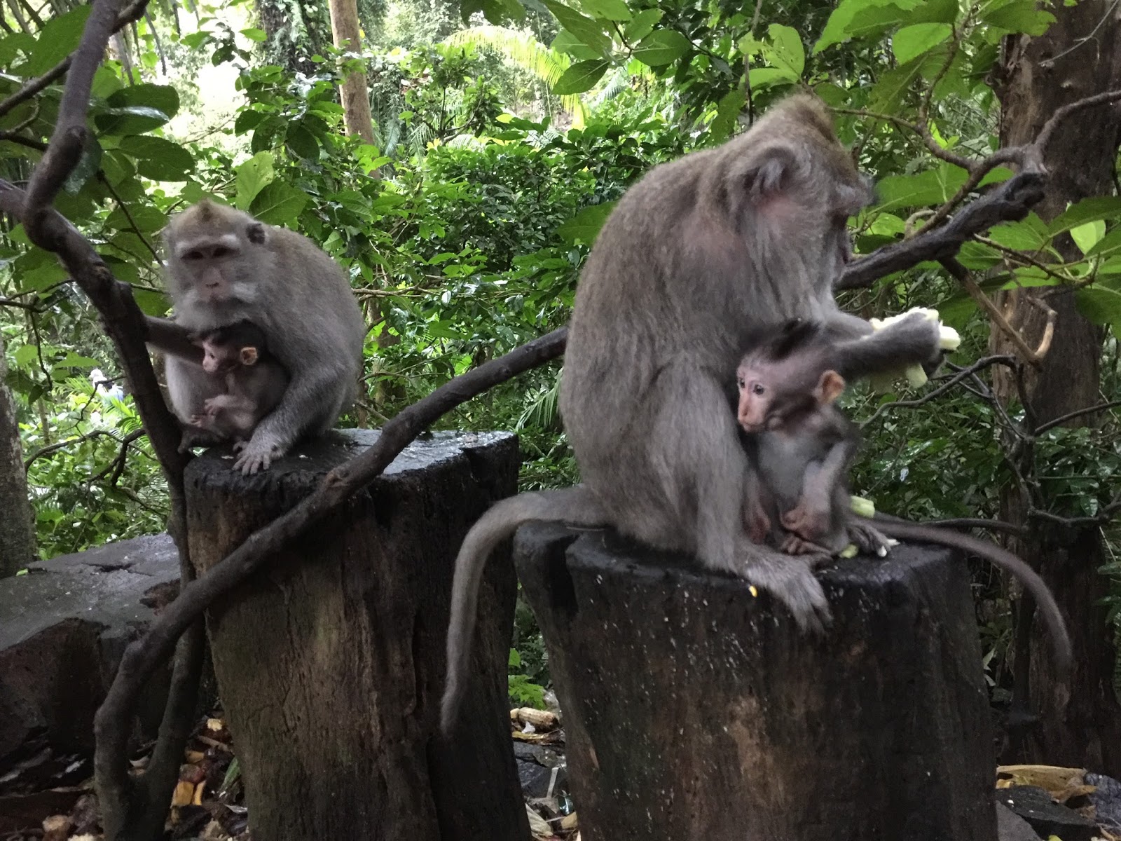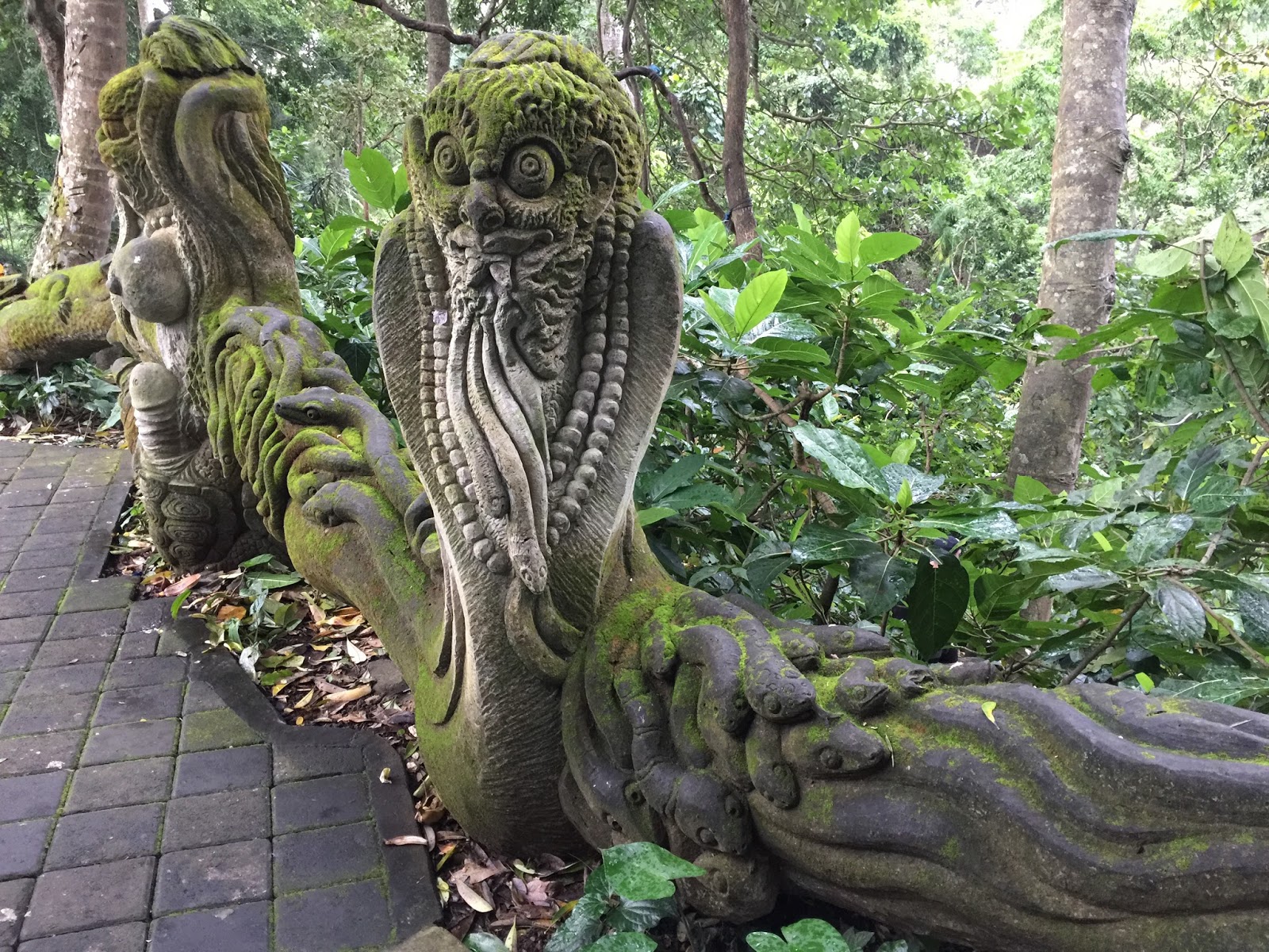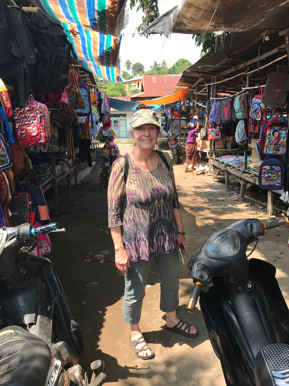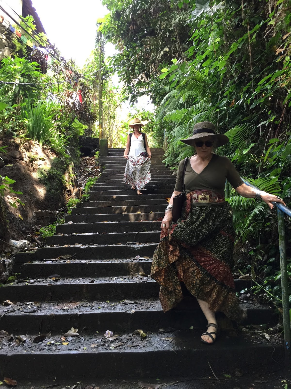 At 10:00 A.M.the traffic is already bad and he takes a detour which still takes us over 30 minutes to drive a few short kilometers. Our plan for the day is to start walking up the Monkey Forest road beginning at the entrance to the Sacred Monkey Forest. This is our last day in Bali and Alisha is looking for a few inexpensive souvenirs to bring home to her family. The day is hot and we cross over to the sunny side of the street to shop and to exchange money. I glance over at Alisha and she is pale, sweaty and clammy. I take her heavy back pack so that she can sit down in the tiny claustrophobic Tabac shop while I finish our money exchange. I am suddenly afraid that she might be coming down with a serious tummy bug or flu and we fly to Flores tomorrow. I steer her up the road and into an open air restaurant where she can sit under the rotating fan. After some time in the restroom she returns, sips at her ginger ale and rests her head on the table. I am seriously worried.