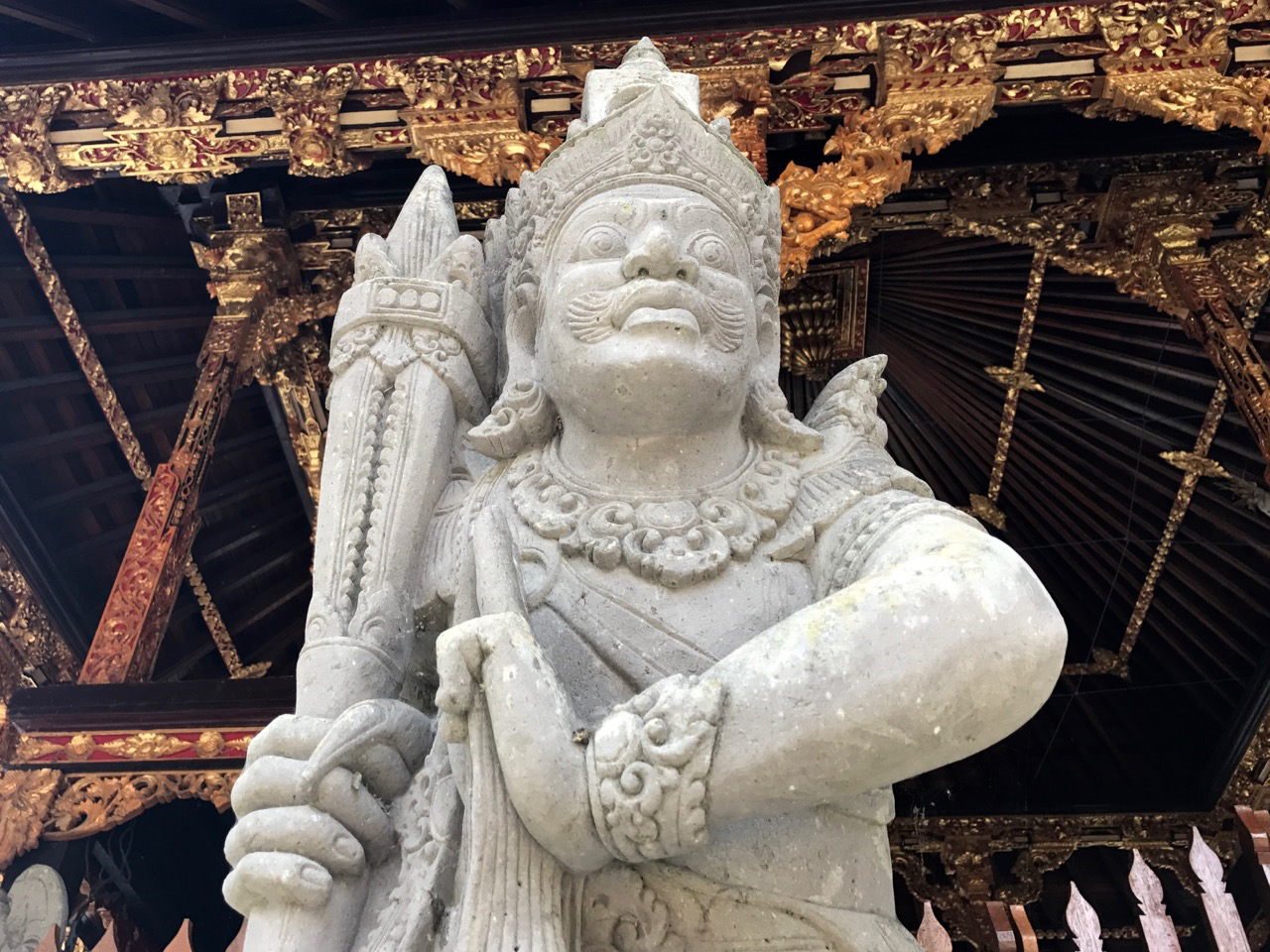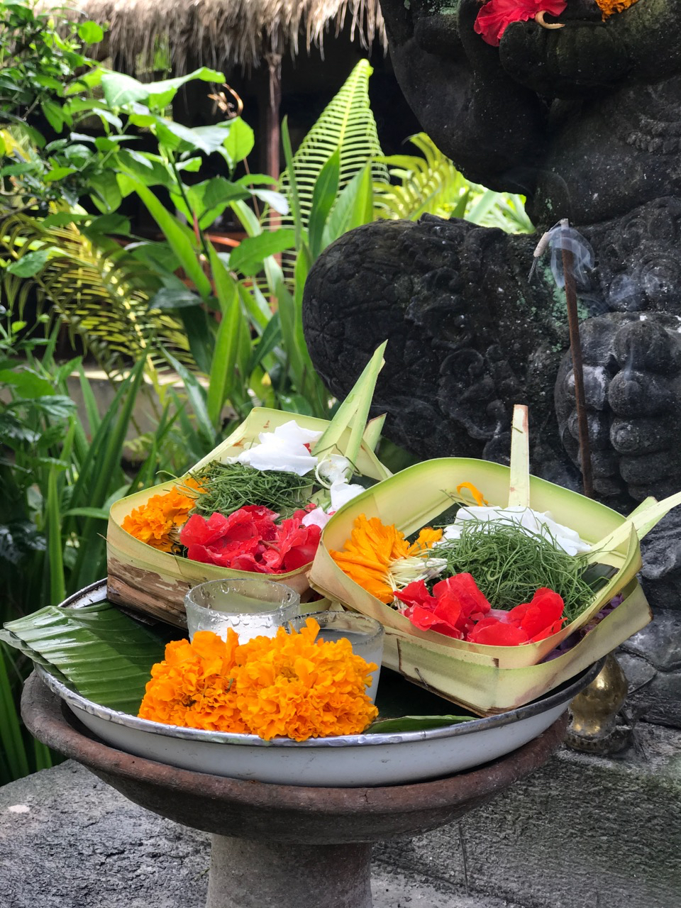 We make our rice paddy walk to Tabra’s house and onto her work compound. As in previous mornings, we see an older Balinese woman carrying flower and incense offerings and watch respectfully as she places the folded banana leaf and flower packets in front of doorways and shrines. With a graceful gesture of her hand she motions the wafting incense towards each intentional spot and we catch the scent of the sweet essence in the clean morning air. At Tabra’s studio, we greet Dekti, sidestep the quiet warning snarls of Tabra’s dog Pumpkin and wait for Dekti’s father to arrive to drive us into town.