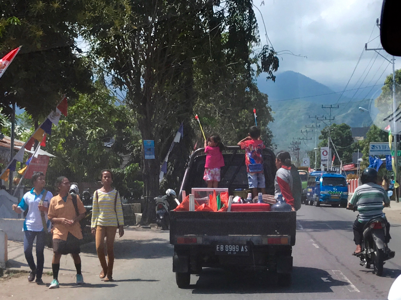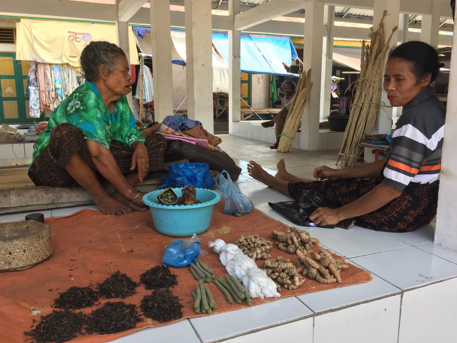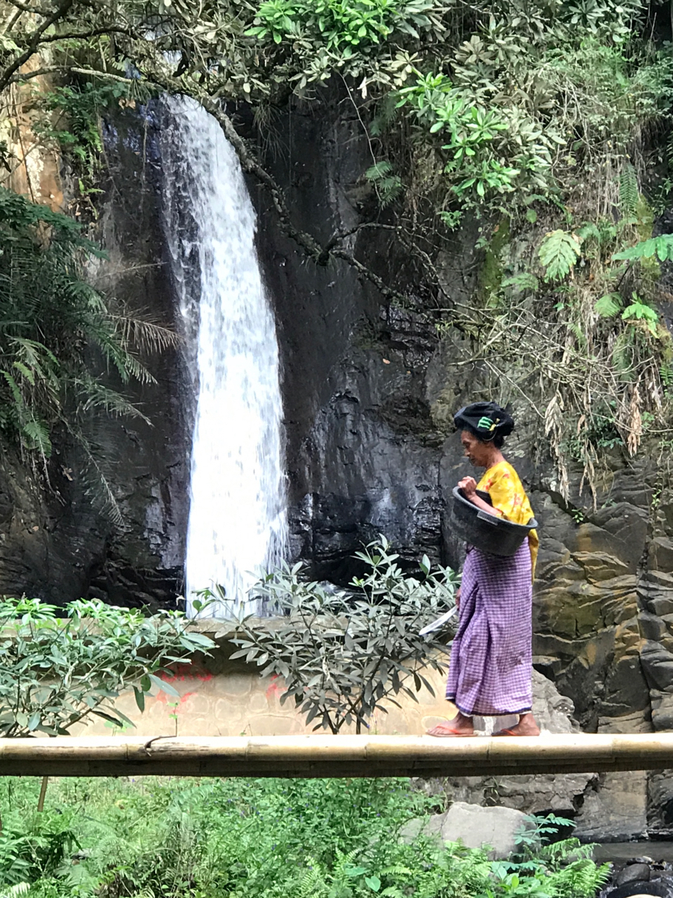 I wake shortly after 6:00 A.M. to the crowing of roosters and bird calls. Our courtyard garden is dripping with dew and I am relishing a peaceful hour writing in our misty garden. The milk in our refrigerator has not been replenished and I make coffee without milk. (All this bounty and I’m complaining about coffee without milk?) Alisha peeks her head from our room and comes to sit with me in the humid cool of the morning. Precisely at 7:30 A.M. Wayane, our toothy and delightful cook opens our courtyard gate and within minutes she has served us strong coffee with milk and sugar and the most beautiful and exotic fruit plates imaginable. Before us are thick purplish red slices of dragon fruit, checkerboard cut mangos, halved mangostiens, papaya and sliced bananas.
