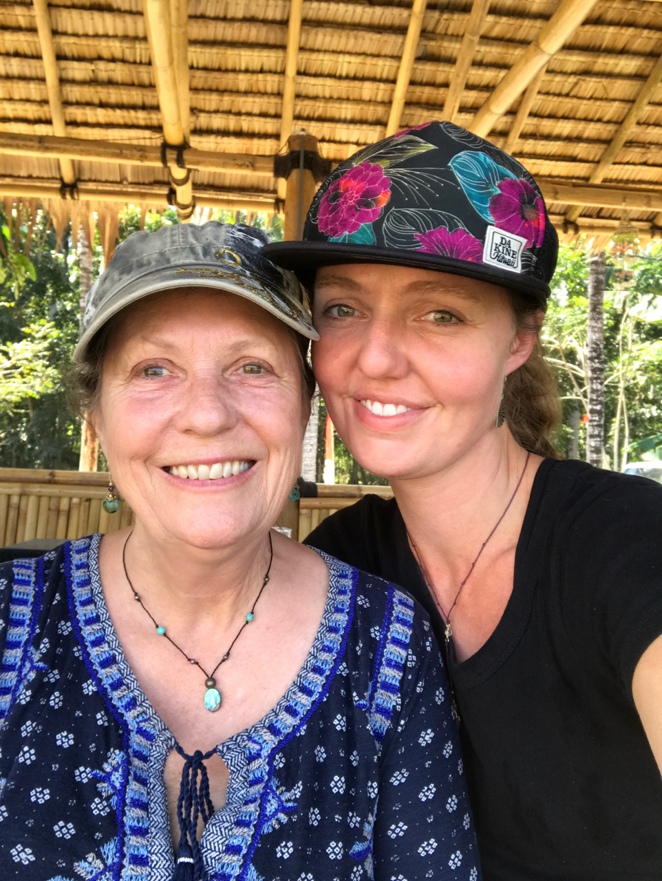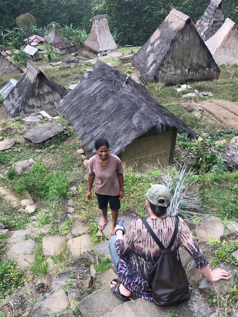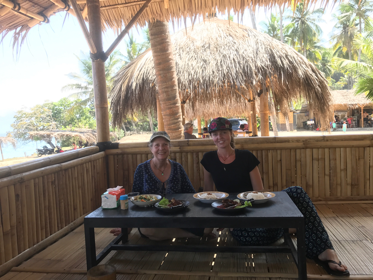 This alone would have been sufficient but it is followed by a variety of 8 sticky rice tapas arranged in banana boat leaves and topped with shredded coconut with drizzles of palm syrup. Not enough? Before we can stop her she has made nasi-goring topped with a fried egg. Not wanting to hurt her feelings, I waddle away from the table and hand a premeditated tip to her for her welcoming and her over the top service. I tell her it is our last day here and her eyes well with tears and she turns away. I am confused and my first thought is that I have not tipped her adequately. With quivering lips she hugs us both and apologizes for her emotions.