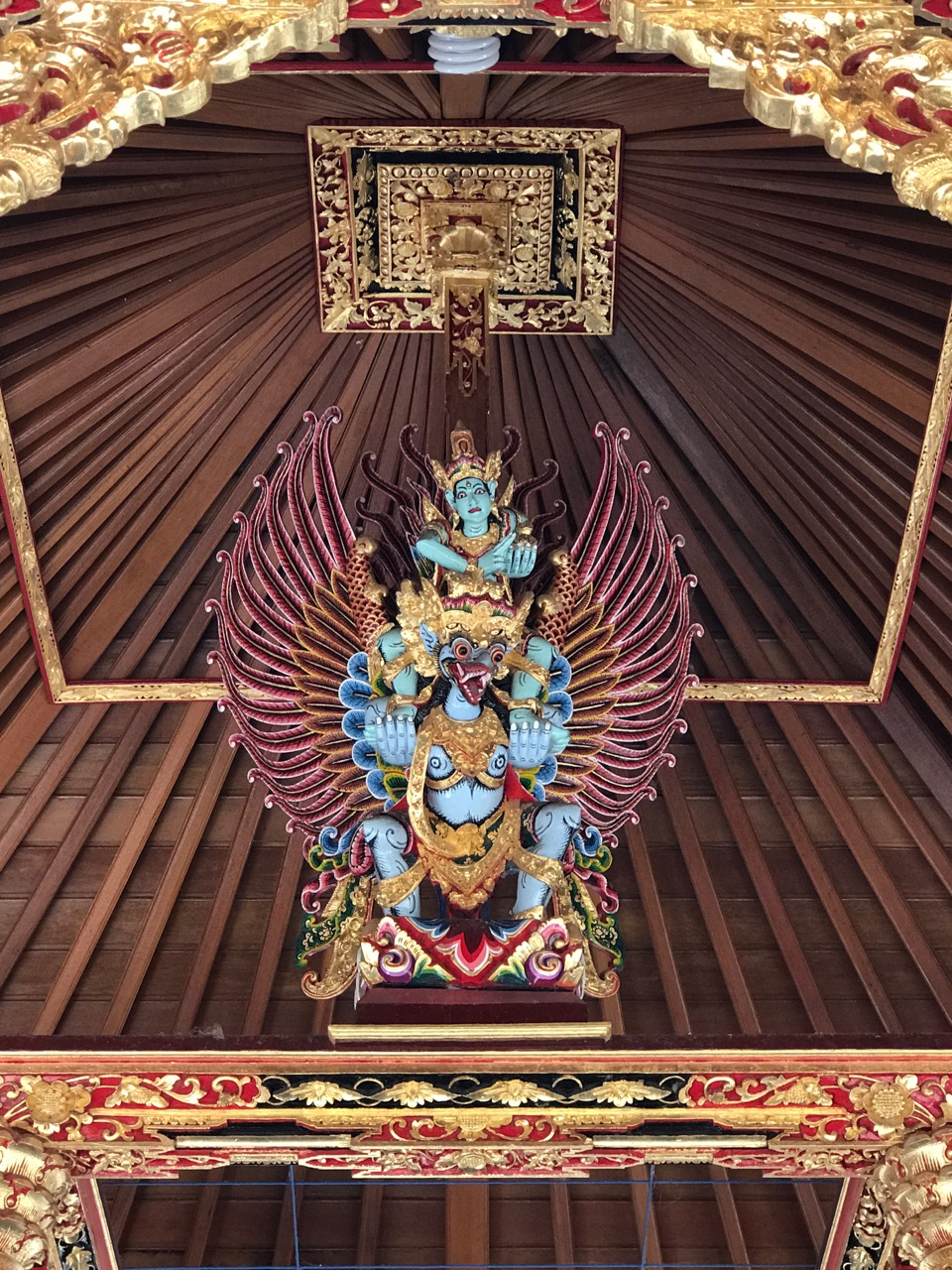 Alisha is snared by one more boutique and exits with a wonderful wrap around skirt, secured by heavy bronze snaps and the waistband edged with suede leather. The skirt and two butterfly wing cut out shirts later, we exit. With blinders on, we walk the many blocks up to the main artery street in Ubud and left in the direction of the staircase up to Penenstana. We decide to have an early dinner at Café Artist, on a side street, this side of the bridge. We cool down with lemon squashes and Alisha and I order fish and Tabra a vegetarian entree. Although not memorable, dinner is good and a bit subdued since this is our last night with Tabra in Bali. Before catching a taxi home, we stop at the mask shop by the bridge and I buy the wonderful Hanamum (monkey god) mask that I saw several days ago. It is intricately carved and the wood beautifully painted with gilded accents. The salesman packages it carefully in layers of bubble wrap and although not unreasonable in price, because of the size and difficulty in transporting it home, it will be my major purchase for the trip. Back at our guest house, we pack and shower. 3:30 A.M. will come all too early.