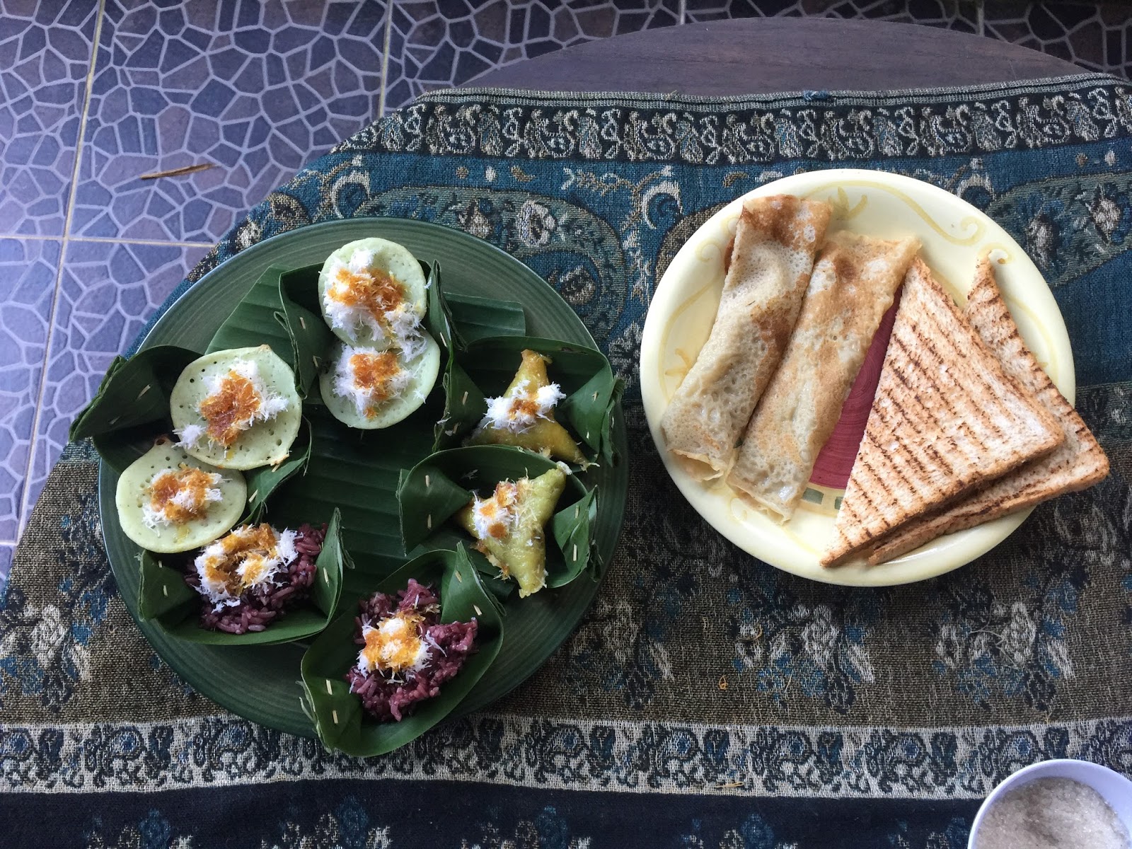 This morning’s breakfast is again more than we can comfortably eat. In addition to Balinese coffee and the expected and colorful fruit plates, Wayane, our gummy, cheerful cook has also prepared a plate of small sticky rice tapas, each topped with shredded sweet coconut and palm sugar and cradled within a folded banana leaf boat. She serves these almost as an afterthought, accompanying two plates of Banana crepes and toast.