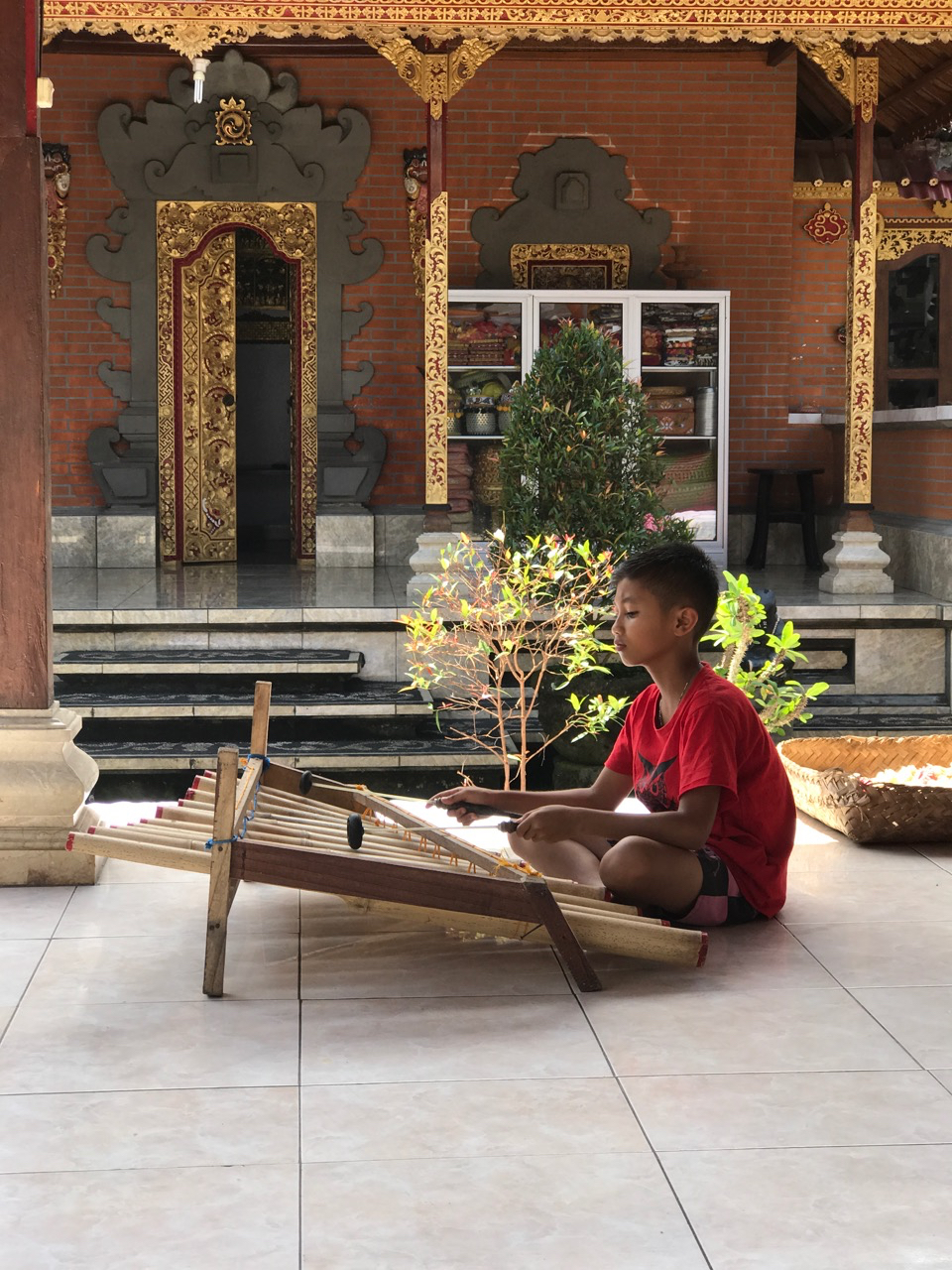 We walk through the back garden area, pass three stalls housing two pigs and a cow, a caged rabbit and lines where fresh laundry hangs to dry. She takes us out the back entrance of her compound and walks with us along the street of her village, unspoiled by tourist guest bungalows, yoga and meditation centers or restaurants. We cross over and enter the gates of another family compound where a master artist is instructing a 20 year old man in the art of miniature paintings. Three teen age students are working on detailed pen and ink drawings and a young boy practices on a bamboo xylophone. I notice that two long tables in the back garden are set with a dozen water bottles each and I surmise that the group of tourists now enjoying lunch will later be brought here to admire (and purchase) this artists miniature paintings. This is the beginning of the swell of the tourism tsunami that will sweep through this village over the next few years. The miniatures he paints are exquisite and I buy an intricate painting of exotic Balinese gods.