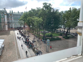 After three hours in the main Hermitage Palace we cross the Palace square to the annex building that house the Impressionistic collection. We have a short break at the museum café and eat two small salads before exploring the galleries. We easily identify the various styles of the many impressionists and viewing these paintings is like visiting with old friends but there are Gauguin’s, Picassos, Monet’s and Van Gogh’s that we have only seen in art history books. I happen to glance outside a window and notice a fashion photo shoot taking place on an opposite roof top. I find it hard to concentrate on the art when I fear that the model, leaning against a flimsy rooftop railing, may fall to her death. The museum guard is also facinated.