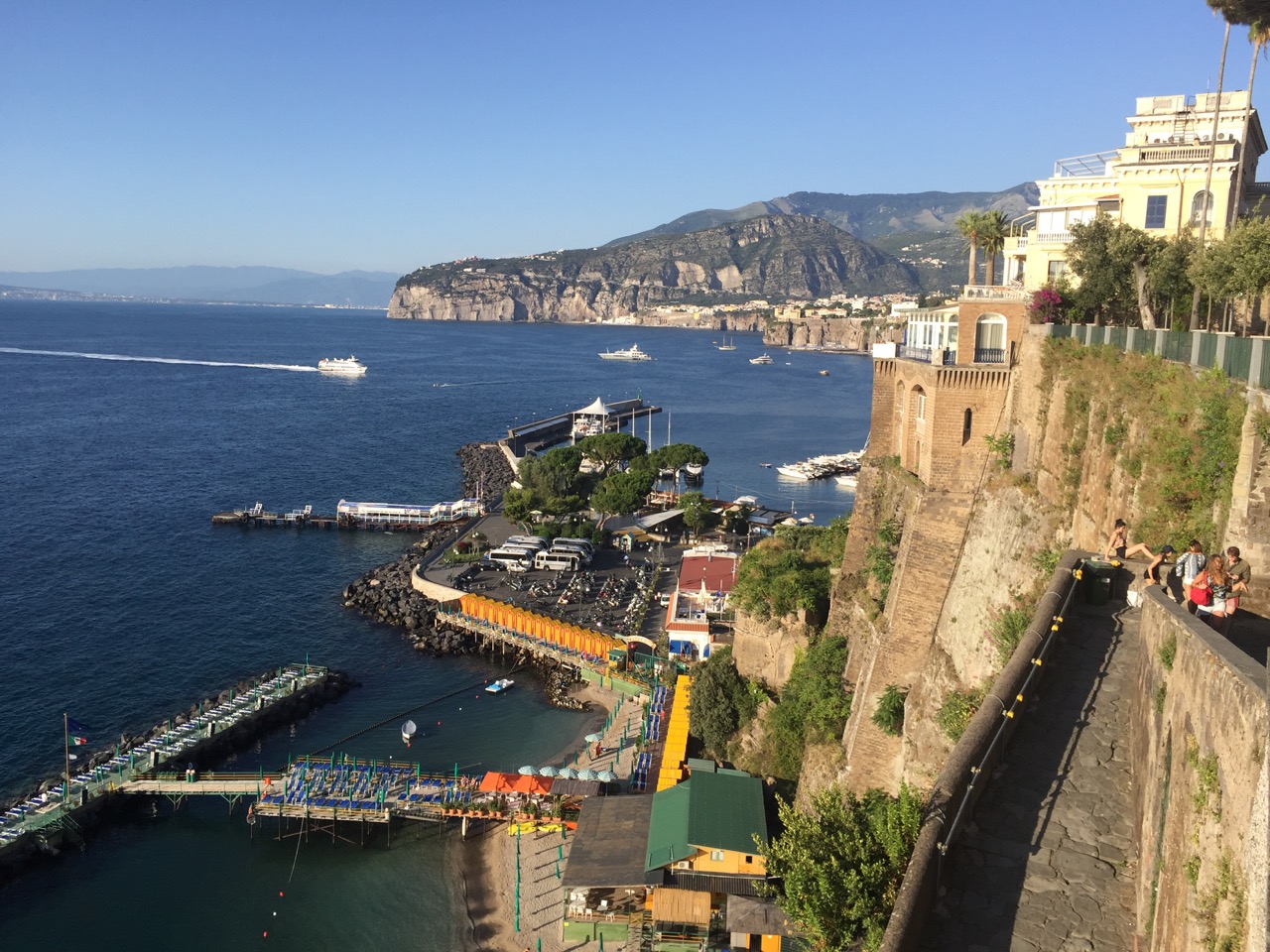 In spite of the fabulous vistas, I grow sleepy on the return drive and find myself nodding off as we are chauffeured to Amalfi. This time we are deposited at the top of the town and walk down the cobbled shop-lined street. An overhead trellis of bougainvillea shades much of the pedestrian walkway. We find a café and sit down for service but after being ignored for five minutes by at least four idle waiters we leave and order cappuccinos at the stand up bar instead. The drive from Amalfi to Sorrento is less than an hour and we watch the countryside scroll past and inhale the dramatic views of the coastline far below.
