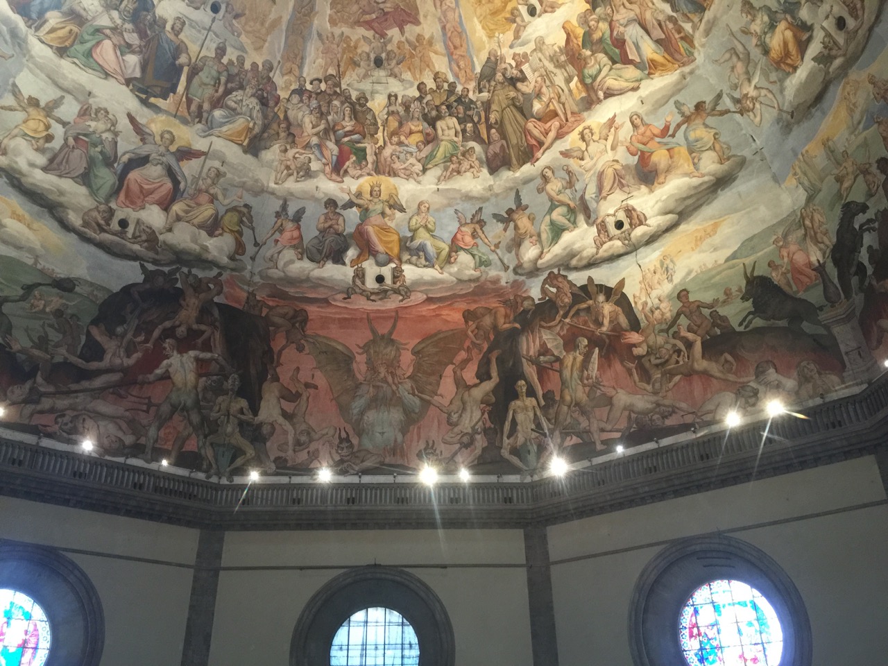 Breakfast is included with our room and is reasonably good with unlimited cappuccinos, slices of ham and cheese and an array of rolls and croissants. We walk to the Duomo and wait briefly in the Florence Pass line and within minutes of opening are climbing the narrow winding stone staircase up to the dome. I am grateful that it is cool inside this stone cathedral but my heart pounds as I climb the stairway, prodded on by those behind me. Several hundred steps later we pop into the interior of the dome and I am able to catch my breath. Looking up, the glory of heaven and the depths of hell swirl around the elaborately painted ceiling of the dome.
