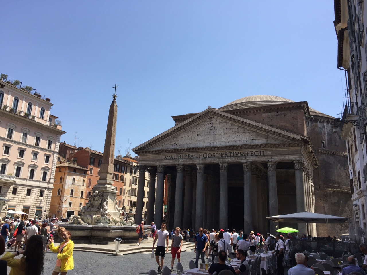 We touch down in Rome just before noon.  Fortunately for John, he has slept the entire way and we all groggily disembark into the muggy heat of the day. Immigration is the easiest that I have ever experienced and we breeze through passport control; disappointed that our passports are scanned and not stamped. We wait 20 minutes until our bags appear on the revolving carousel and push through the doors of the terminal to street beyond to find transport to Hotel Antica Locanda in the Monti district of Rome.  We appreciate the Rick Steve’s guide book advice which suggests that for parties of 2 or 3, taking a taxi into Rome is easier and more economical than taking the train and transferring to the subway.  Forty-five minutes and a set 48 Euros later, our taxi drops us off at our hotel.