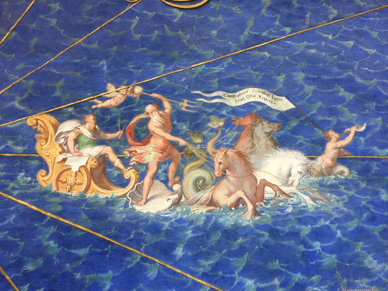 We loose John somewhere in the museum and Art and I wander together through rooms filled with remarkable masterpieces. In the midst of all these masterpieces, a small painting by Jacopo Zucchi, the Allegoria Della Scoperta dell’ America, captures my eye. Water nymphs hold coral and rays and shells ripe with pearls. A jeweled treasure of shells and coral surrounds Neptune, crowned with coral. When we catch up with John later he remarks on this painting and tells me it his favorite painting in the museum.
