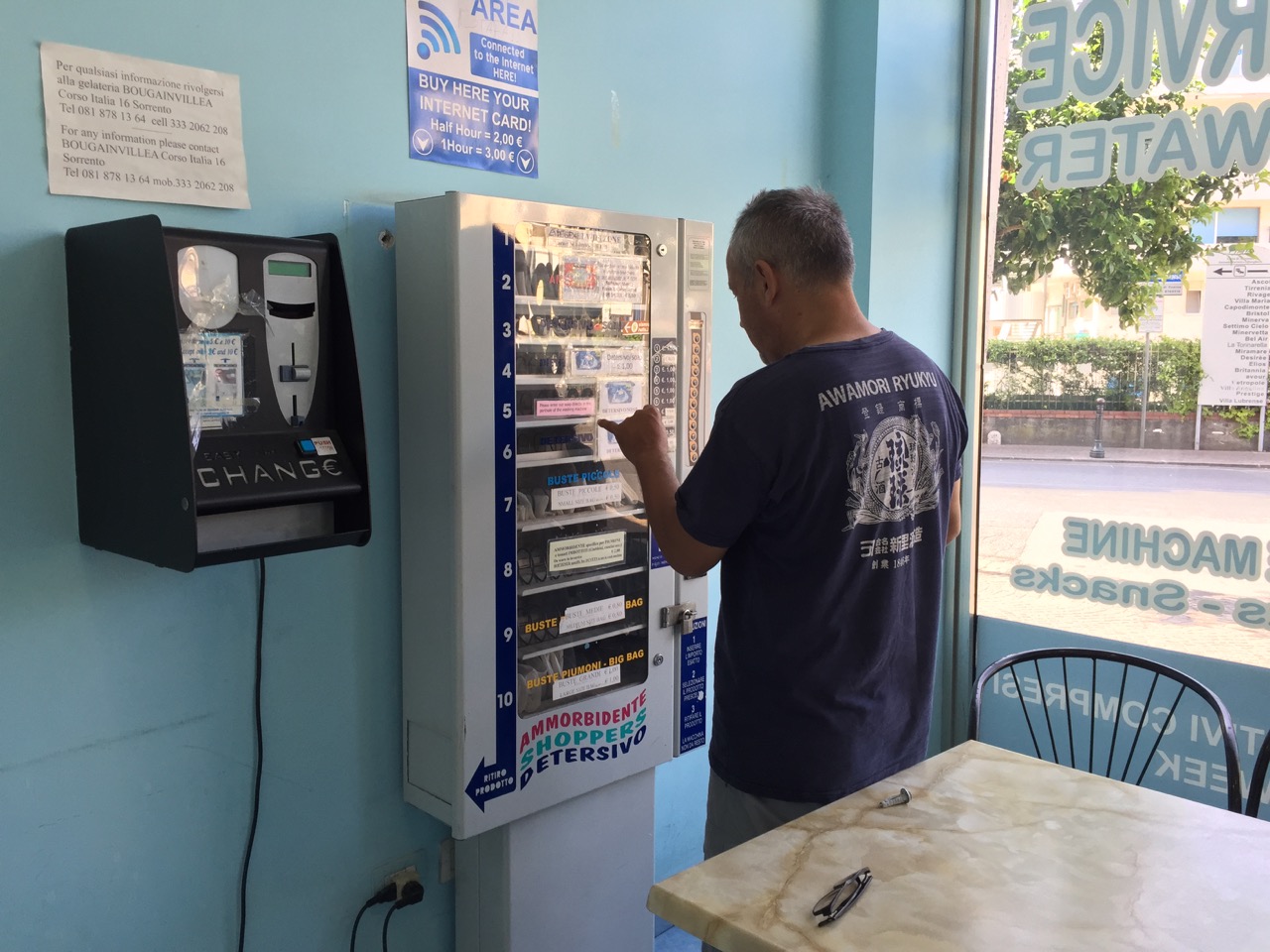 Village houses cling precariously to the cliff sides high above the Tyrrhenian Sea. The rugged coastline is very Big-Sur-esque and I snap hundreds of bad photos out the van window, most of which I later delete. We have read about the white knuckle Amalfi Coast road but I feel no angst with our competent driver and a stone guardrail separating us from the sea below. We make a rest stop at an upscale café/tourist shop and John and I order cappuccinos. The blue of the counter visually melts with the blue of the ocean beyond.