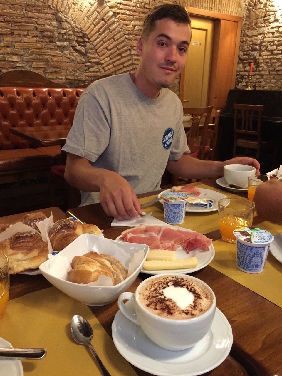 We enjoy our first generous and delicious breakfast in the charming dining room of our hotel . We are welcomed with strong coffee with milk, croissants, cured slices of ham and thick slices of cheese, yogurt and orange juice.
