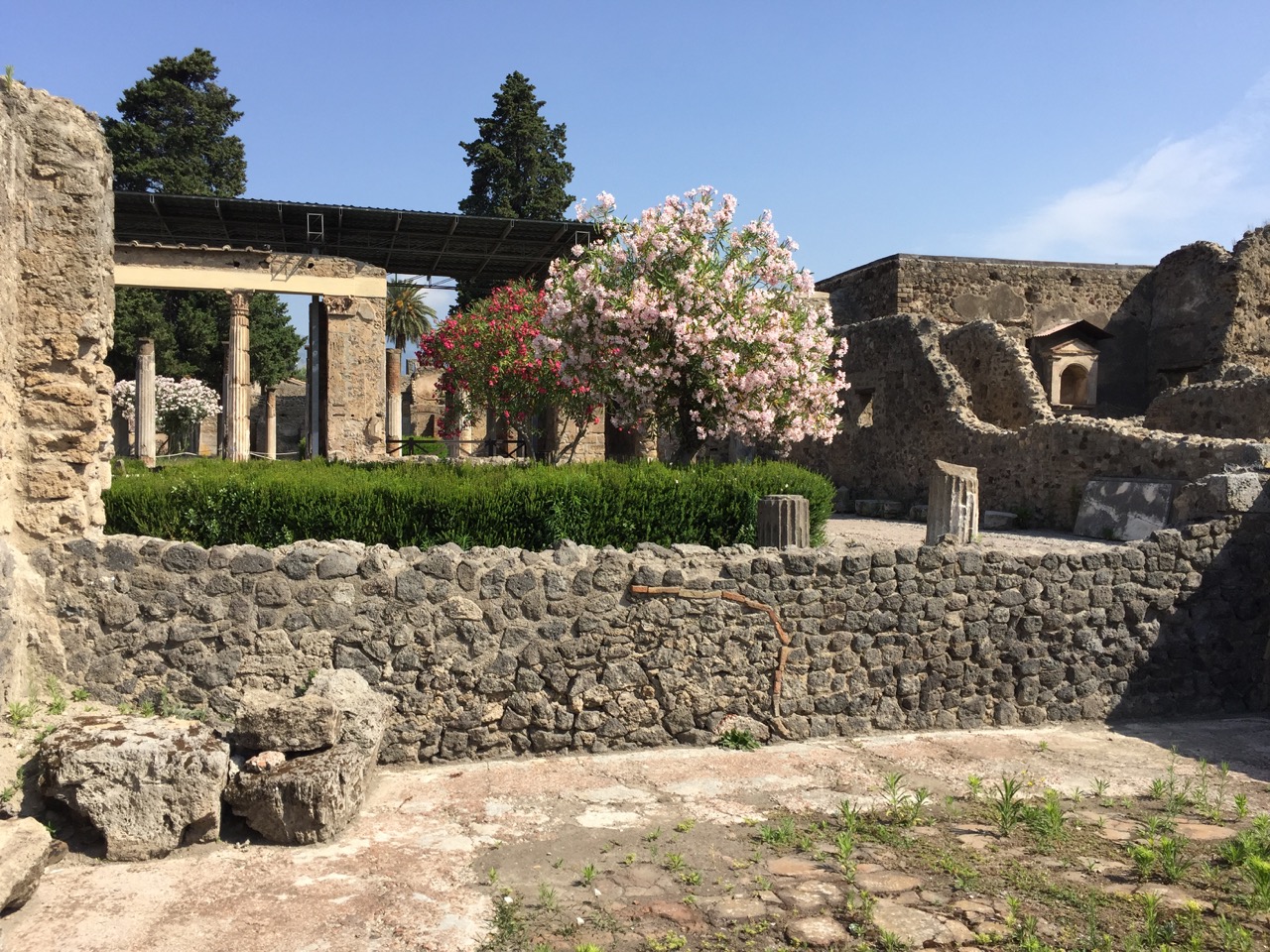 The stone streets are paved with immense stone blocks with obvious chariot wheel grooves cut deep into the rocks. This city prospered in the first century A.D. prior to the eruption of Mt. Vesuvius and had a sophisticated aqueduct and lead pipe water delivery system.  We see remains of private estates with re-created manicured gardens and shopping streets where restaurants once thrived.
