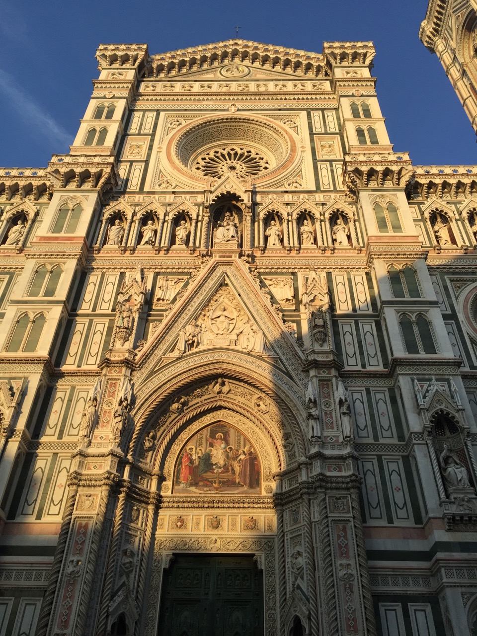 The evening light casts a golden glow on the multicolor marble of the immense cathedral and we stroll around the bustling plaza, people-watching and stopping to admire the bronze Ghiberti doors of the Baptistery. These doors are old friends of mine but are no less impressive on my fifth visit to Florence.