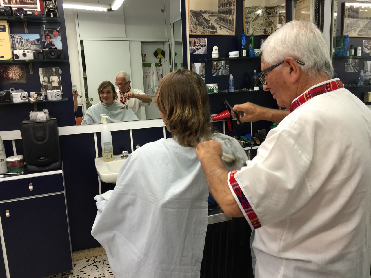 In spite of the disappointing meal, we manage to salvage the afternoon and walk the short distance to the Coliseum and the Roman Forum and instead of snapping at each other, we are snapping photos.  We are not up to tackling either of these sights today but wander along the perimeter taking photos and people watching. The temperature is in the high 90’s and the sun is brutal. I have left both my hat and dark glasses in the hotel and before long I feel dizzy and need to return to our air-conditioned hotel to rest. We wander slowly back and once out of the sun, I feel better. John has let his hair grow long, partially out of laziness and partially to be in character for the Pirate Festival but in Rome, the men are trimmed and stylish and John feels noticeably out of place. When we pass a barbershop John decides to get a haircut. It is air conditioned inside the two-chair shop and John asks the elderly barber the price for a haircut. It is $20 and Art and I collapse onto an ancient couch and John mimes the style of hair cut he wants and then turns to me and asks if I have a photo of him a year ago at “Grandpa’s” 98th birthday? I pull a photo up on my I-phone and John shows it to the barber. It is cool inside and for a few minutes, Art and I watch as John’s long locks fall to the floor but our hotel is just around the corner and we leave John on his own. When John returns, he preens in front of the mirror, delighted with his new look.